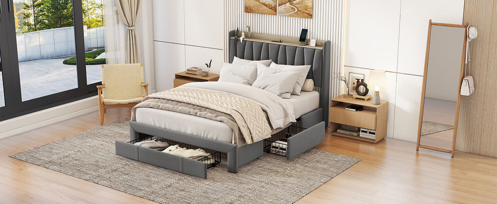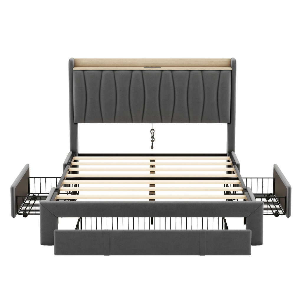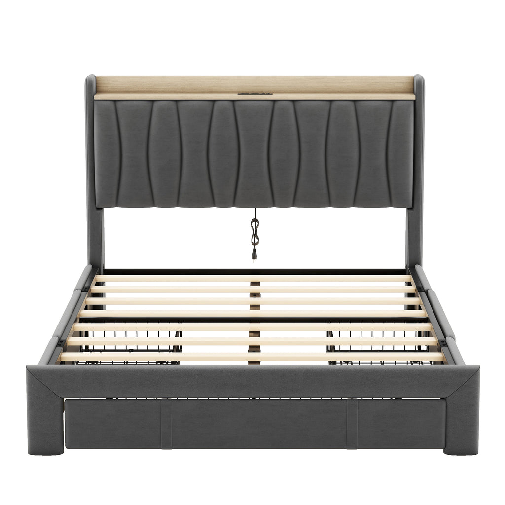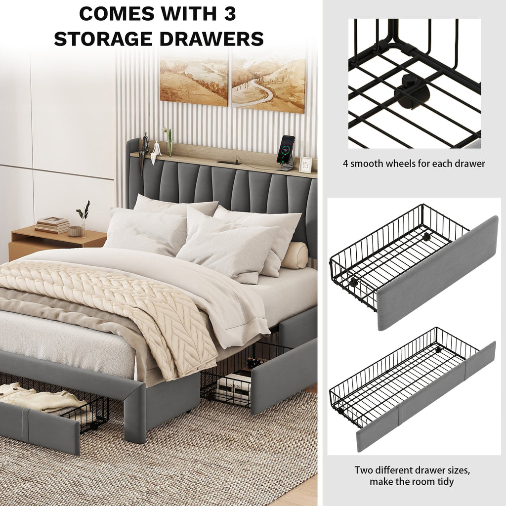 The combination of dark gray velvet and maple wood frame gives this upholstered platform bed with drawers a modern and classic design style, adding a unique artistic touch to the bedroom. Metal construction makes this bed sturdy and durable. The headboard is filled with highly resilient foam that is soft and lightweight for your comfort. Ample storage space and bedside charging station will provide convenience for your life.