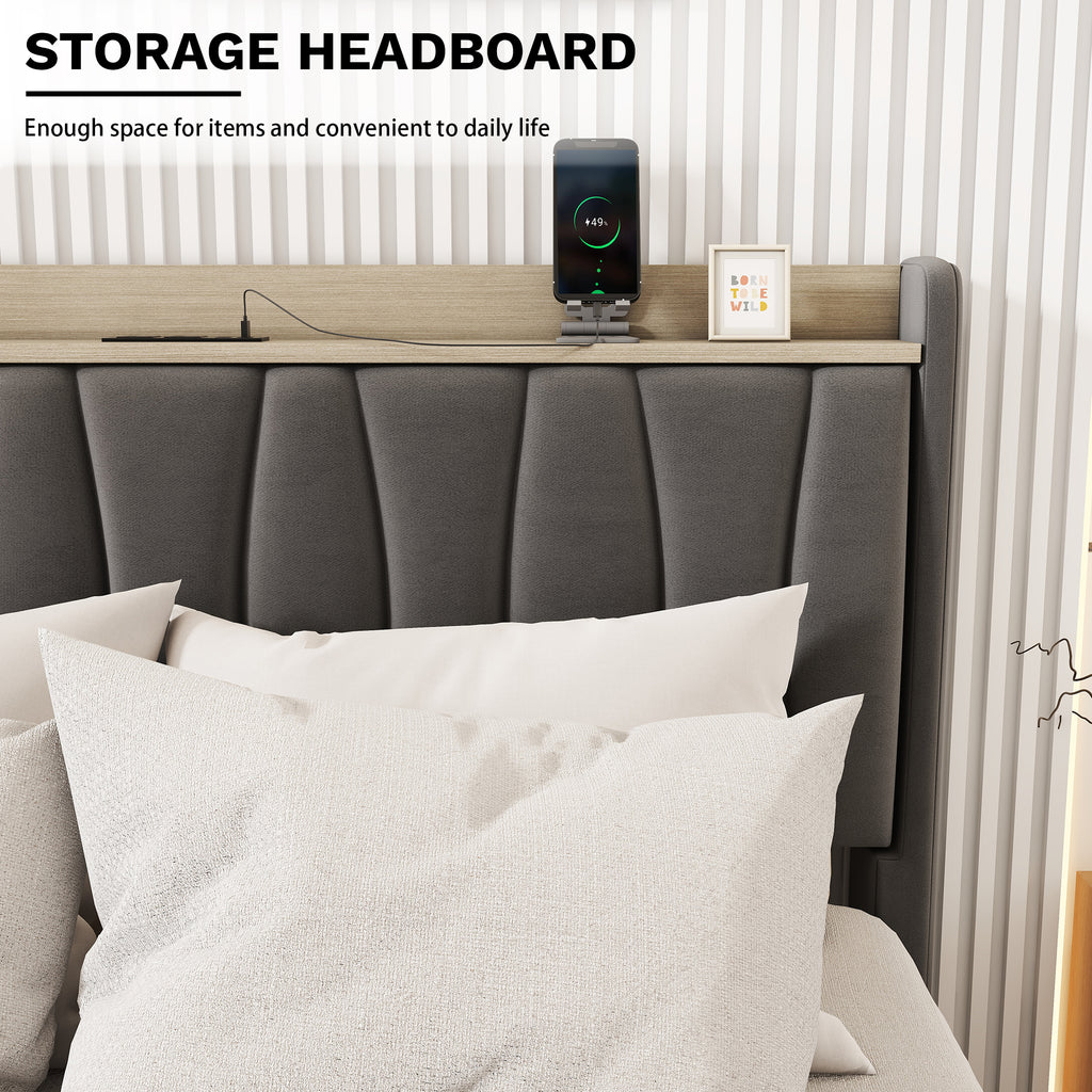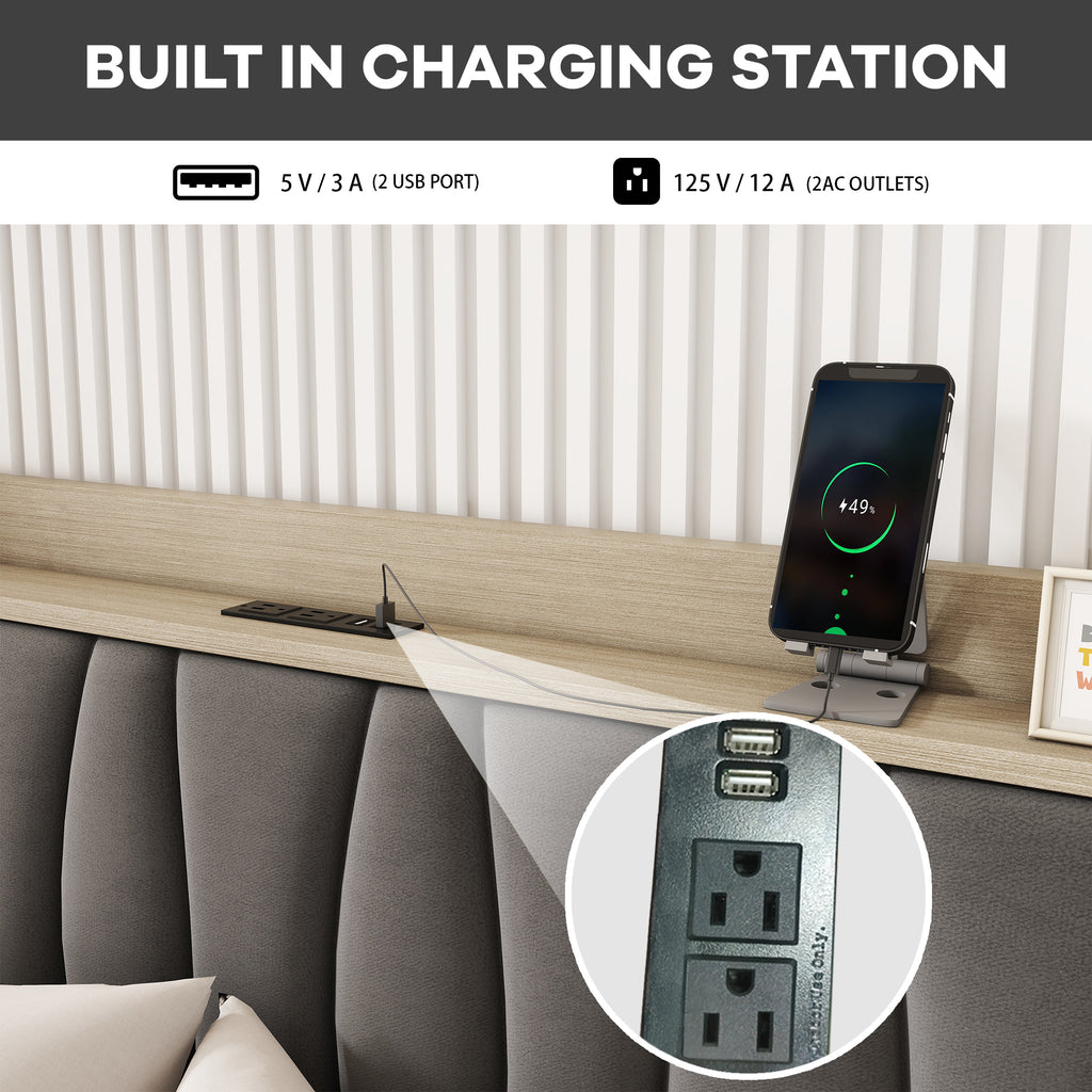 Storage Headboard with Charging Station: The practical headboard combines storage and charging features for your convenience. You can place your glasses, night light and decorative items on the headboard, while charging your electronics within reach!