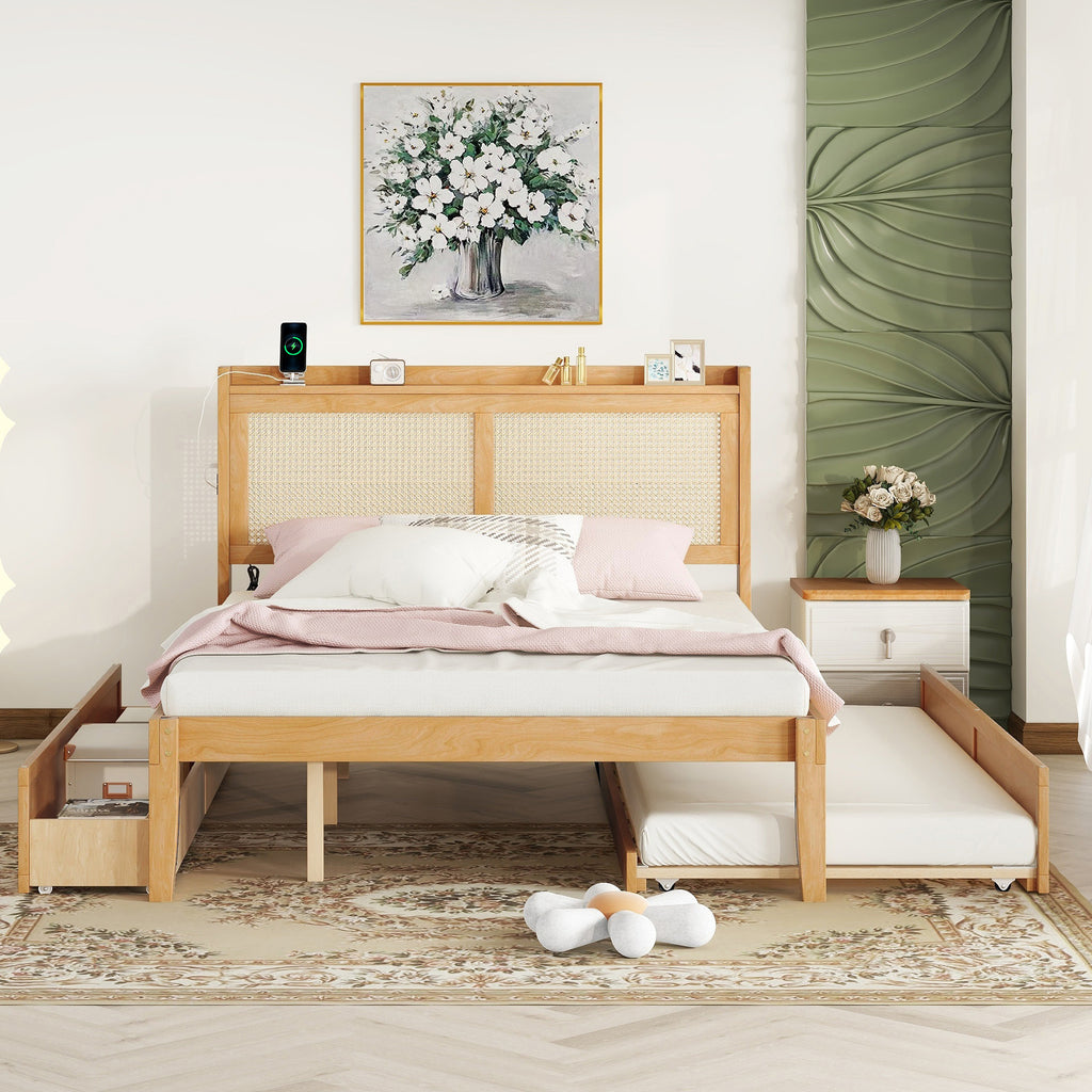 - [Stunning Rattan Headboard] Add a touch of sophistication to your bedroom with our intricately woven rattan headboard, bringing warmth and texture to your space. Set the mood with built-in LED lighting, featuring a variety of colors and brightness levels controlled effortlessly by a remote, adding a touch of ambiance to your bedroom oasis.