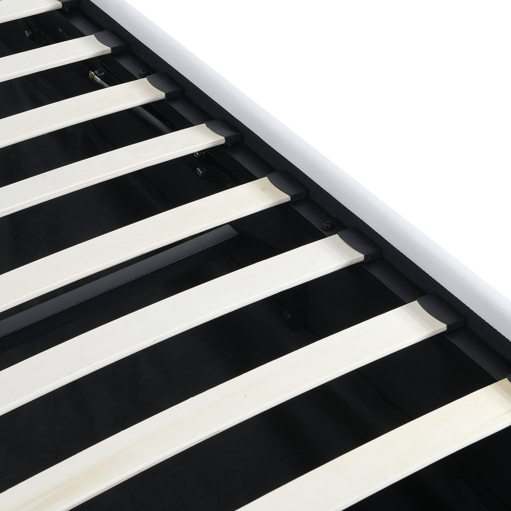 - [High Load Capacity]The slatted frame is made of a combination of metal and wood, the bearing capacity is up to 500LBS, this faux leather upholstered bed can stay firm and quiet when sleeping, there is a slatted support mattress without a box spring
