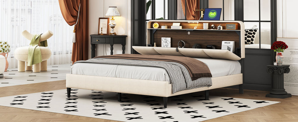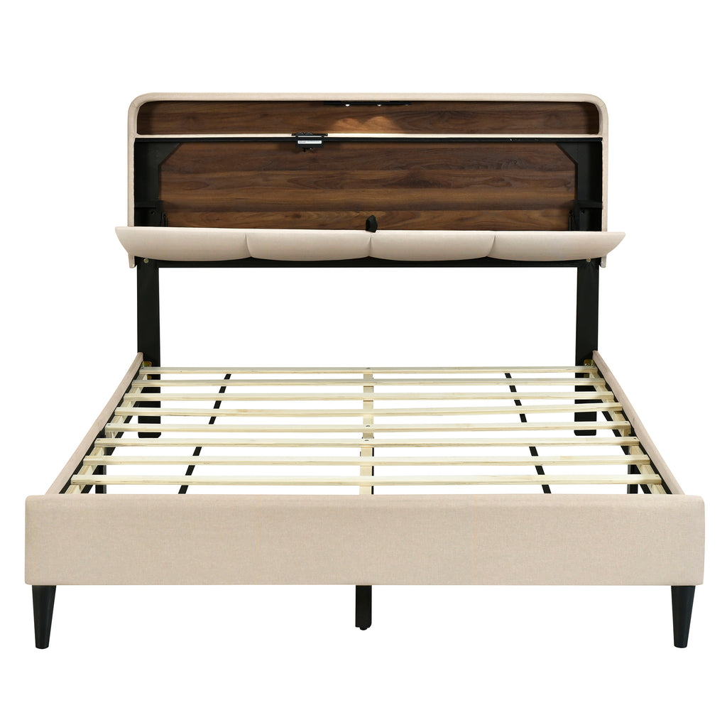- [Versatility]This upholstered bed features a book shelf at the headboard and USB charging ports and sockets.The sensor light is available for you to spend your quiet night.In addition, the headboard can be opened to hide a huge storage space inside.this bed meets your various needs
