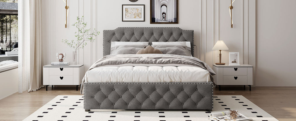 - [Elegant Design] Upholstered in carefully-selected linen fabric and with button-tufted design headboard and footboard, this platform bed not only suits any home décor, but is timeless in its design. The single color of the design creates versatility. Headboard is included as a comfy linen fabric backrest that brings you and your partner a cozy feeling.