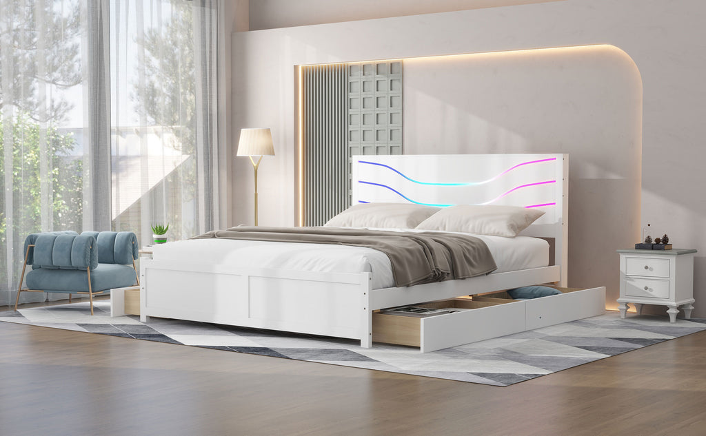 Queen Size Wood Storage Platform Bed with LED and 4 Drawers, White