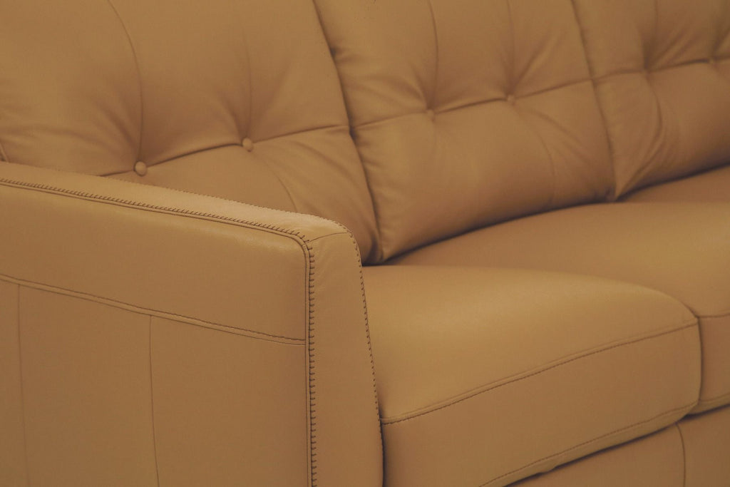 Combining the stunning visual effect of art with lines and comfort, the Radwan sofa set is one you’ll want to spend lots of time in. This beautiful caramel or pesto green leather sofa features button tufted cushions with contrast tone stitching and unique tapered wood legs. Its deep, comfy seat and flared padded arms give it an incredible sink-right-in quality that’s perfect for the whole family.