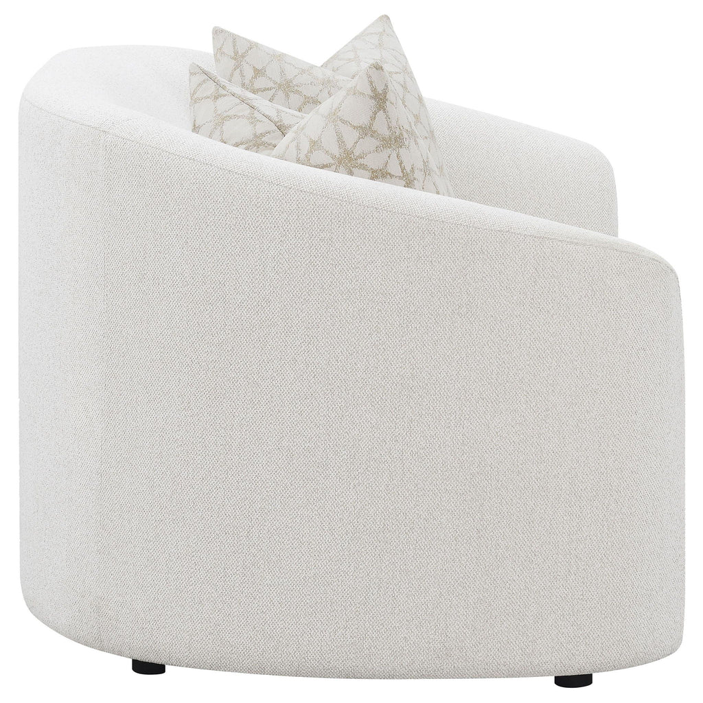 The living room set captures the perfect balance of modern warmth and sculptural design. Each piece is wrapped in soft latte boucle upholstery, creating a cozy yet elevated texture. Curved silhouettes and sloped armrests lend a contemporary feel, while plush cushions and tailored backs ensure enduring comfort. Accent pillows with faux down fill add inviting softness and refinement. Blending timeless craftsmanship with modern aesthetics, this collection transforms any living space into a serene and stylish retreat.