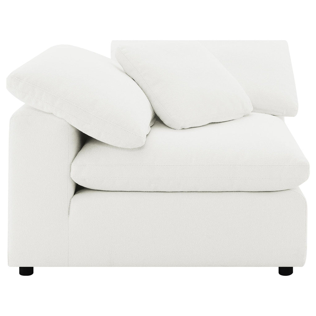 Center your relaxed living space on a modern five-piece sectional sofa, taking a laid-back approach to seating. This sofa, upholstered in tailored water-resistant boucle performance fabric with topstitch details, offers a refined, contemporary style in a neutral hue, perfect for any inviting living room. Customize your seating space with modular options, allowing you to create the perfect lounging environment. The plush, feather blend filled cushions will leave you motionless in ultimate comfort, as if wrapped in airy, cloud-like seating. Wide track arms add structure to the low slung silhouette, while an included ottoman encourages relaxation and round legs provide excellent support, complete with plastic glides to protect your flooring.