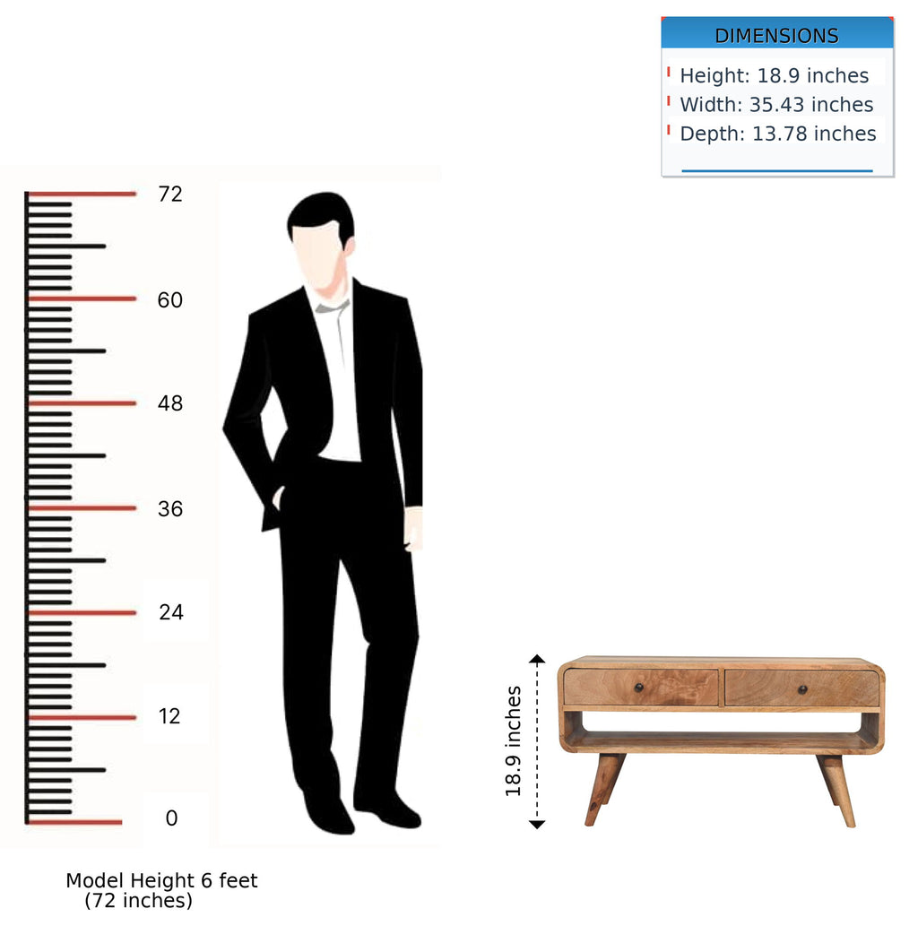 - Artisan Furniture Solid Wood Reverse Curve Oak-ish Media Unit - Introducing our reverse solid timber media unit, it is expertly constructed from 100% solid mango wood in a lovely oak-ish finish. This modern design offers clean, curved edges and features 2 drawers that come with a shiny knob, a large open slot to place any books, photo frames, or ornaments, and 4 Nordic style legs.