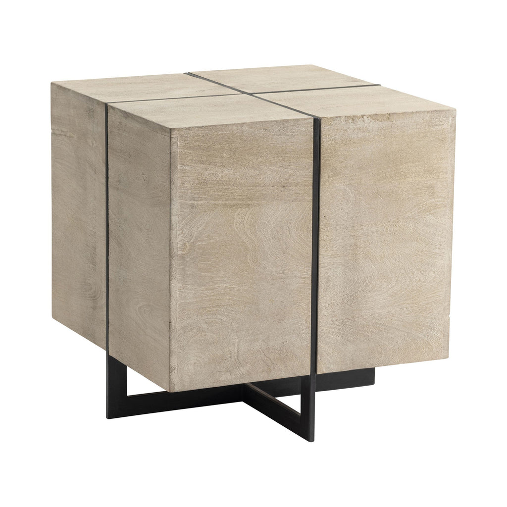 The Crestview Collection Bengal Manor Antique Black and Mango Wood White Wash Rectangle Squares End Table has a modern, geometric design. This cube end table sits atop black metal legs in a cross design. The metal divides the table into four quadrants ad enhances the white wash finish. This transitional table is made of solid, sturdy Mango wood.