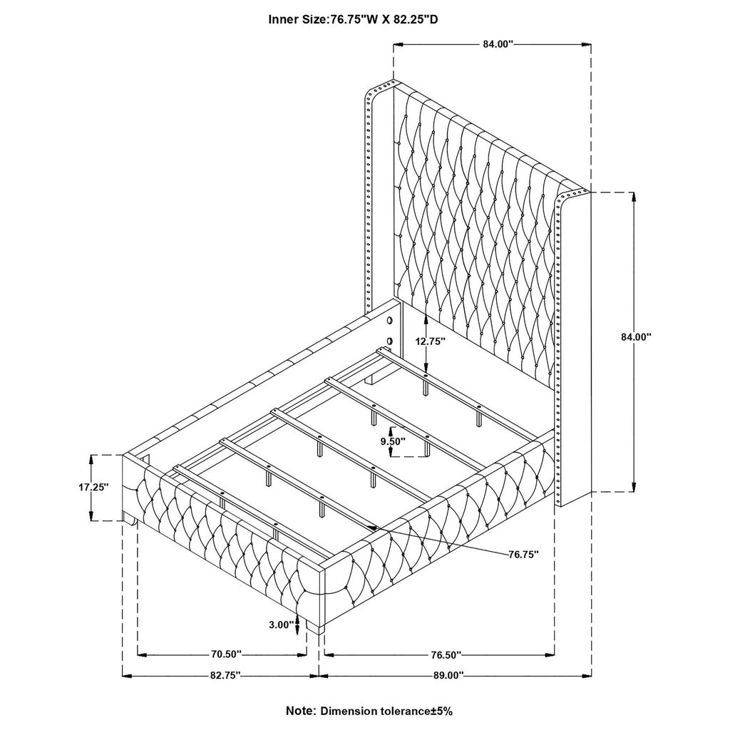 Choose to snooze in this exciting and elegant panel bed. A dramatically tall headboard with a modern wingback design takes the center stage of your bedroom. Entirely upholstered in luxurious velvet, this piece instantly becomes a focal point. This bed is adorned with deep button tufting for an extra level of glitz and glam. Sits on block style legs for support.