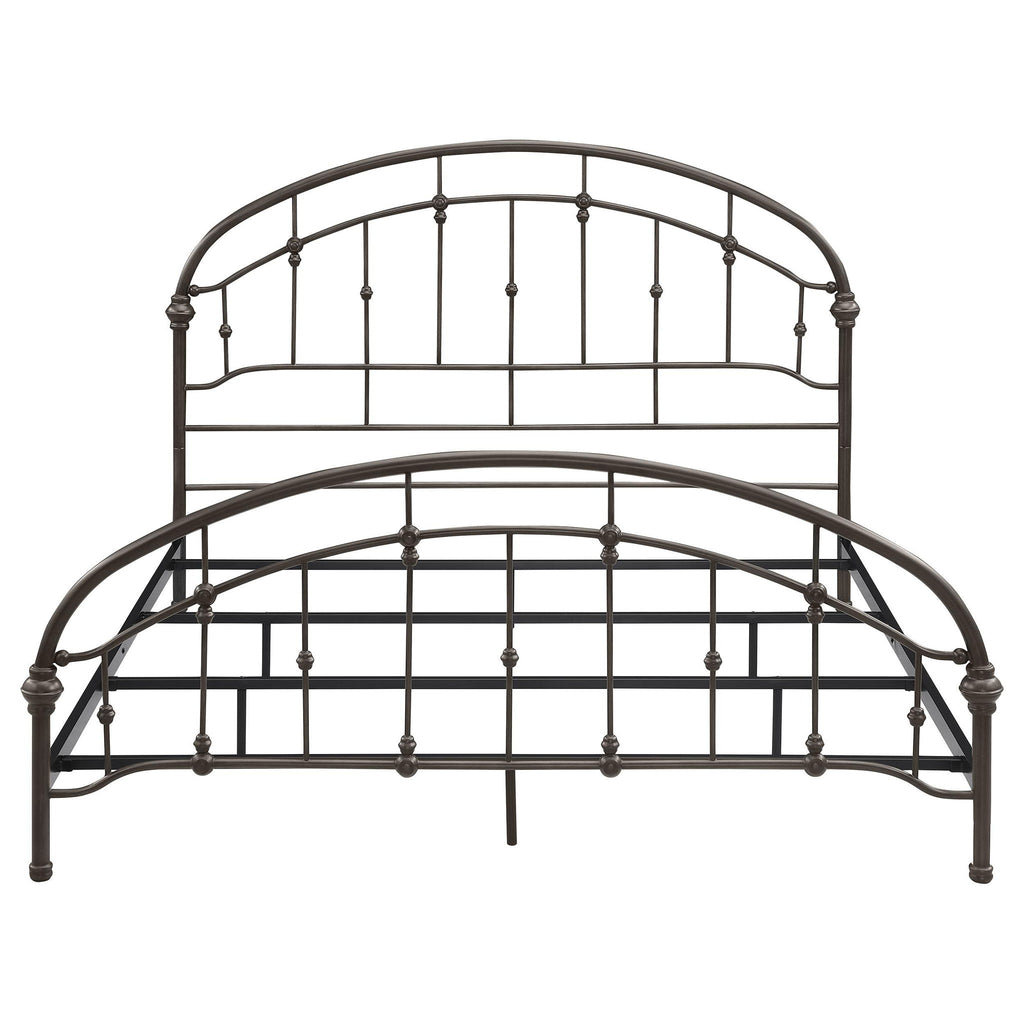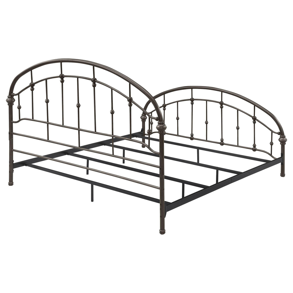 Add timeless appeal to your bedroom with this vintage-inspired metal bed frame, finished in a rich dark bronze for added sophistication. Featuring arched headboard and footboard designs with intricate detailing, this frame is crafted from heavy gauge metal for durability. Secure metal slats provide stable support for a box spring and mattress, combining elegance with functionality. Perfect for traditional or modern bedroom styles.