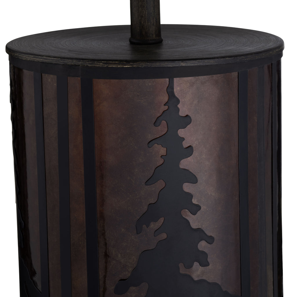 Enhance your decor with the Crestview Collection Rowan Oak Table Lamp, featuring a striking cylinder base of amber mica adorned with laser-cut metal trees. The natural linen shade completes the look, casting a warm, inviting glow. This unique piece blends nature-inspired design with craftsmanship for an artisanal aesthetic.