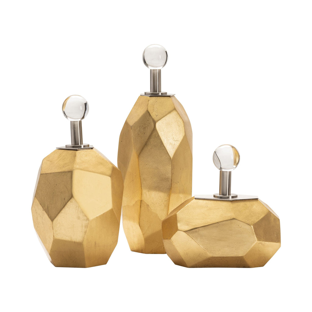 The Crestview Collection Roxy Boxes includes three multi-faceted boxes of varying sizes. Each box features a shiny gold finish so they are sure to catch anyone's eye. A silver lid and handle with a decorative ball on top allow the boxes to open and close. These boxes have a sturdy metal construction.