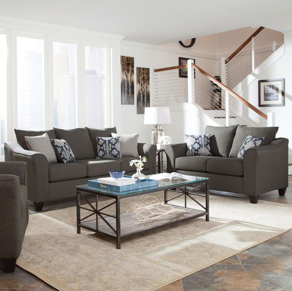 Timeless in design and rich in comfort, this sofa set unites coordinated silhouettes that balance form and function. Each piece features flared arms, foam cushions, and tailored upholstery that enhance a room’s sophistication while maintaining everyday comfort. Decorative accent pillows add texture and contrast, while the scaled design makes this set ideal for both cozy and contemporary living spaces.