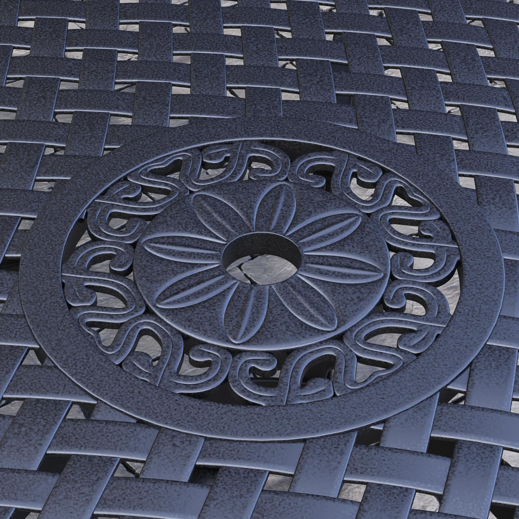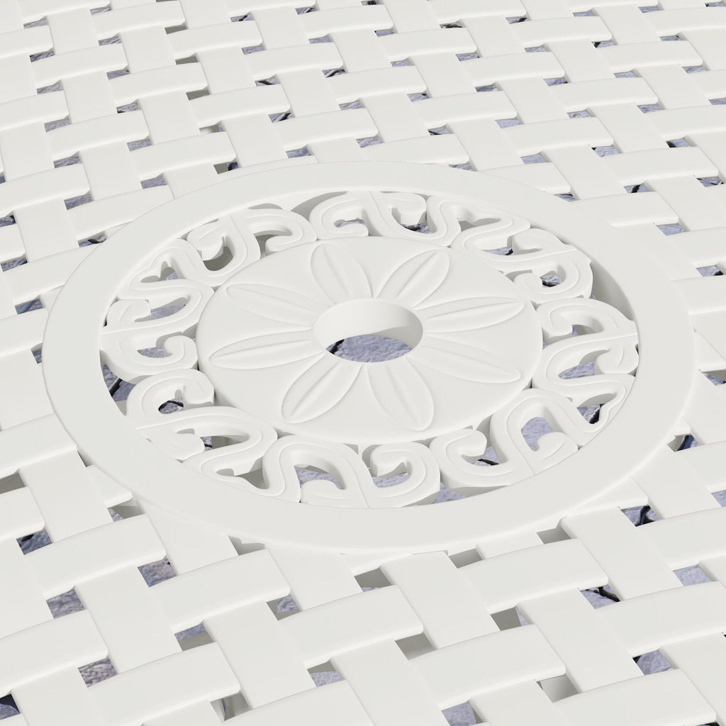 The difference between an average backyard and an open air sanctuary is found the classic comfort and traditional style that Sanibel delivers. This dining set includes a round table and arm chairs, all made of cast aluminum with a powder-coated finish and a clear coat that offers total protection from the elements. The tabletop and seat design allows water to quickly drain through to prevent pooling or staining. The center umbrella hole includes a cap to cover it when not in use.