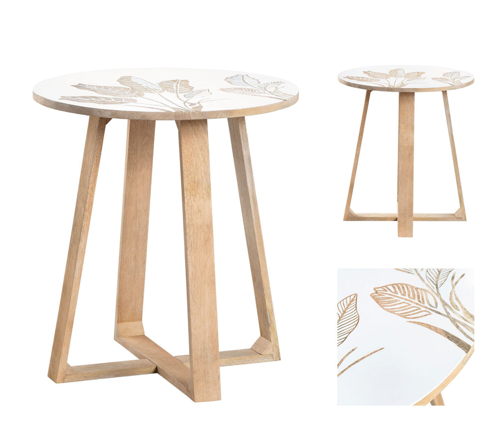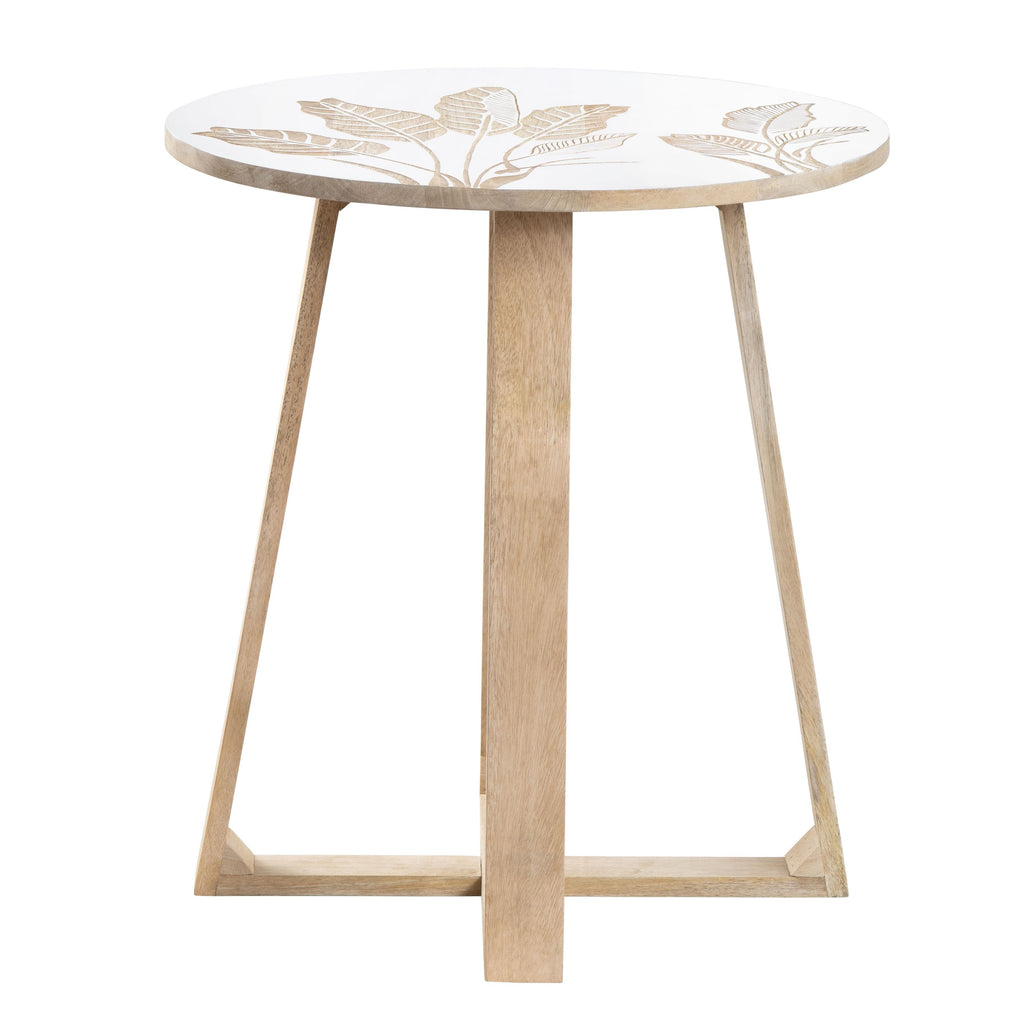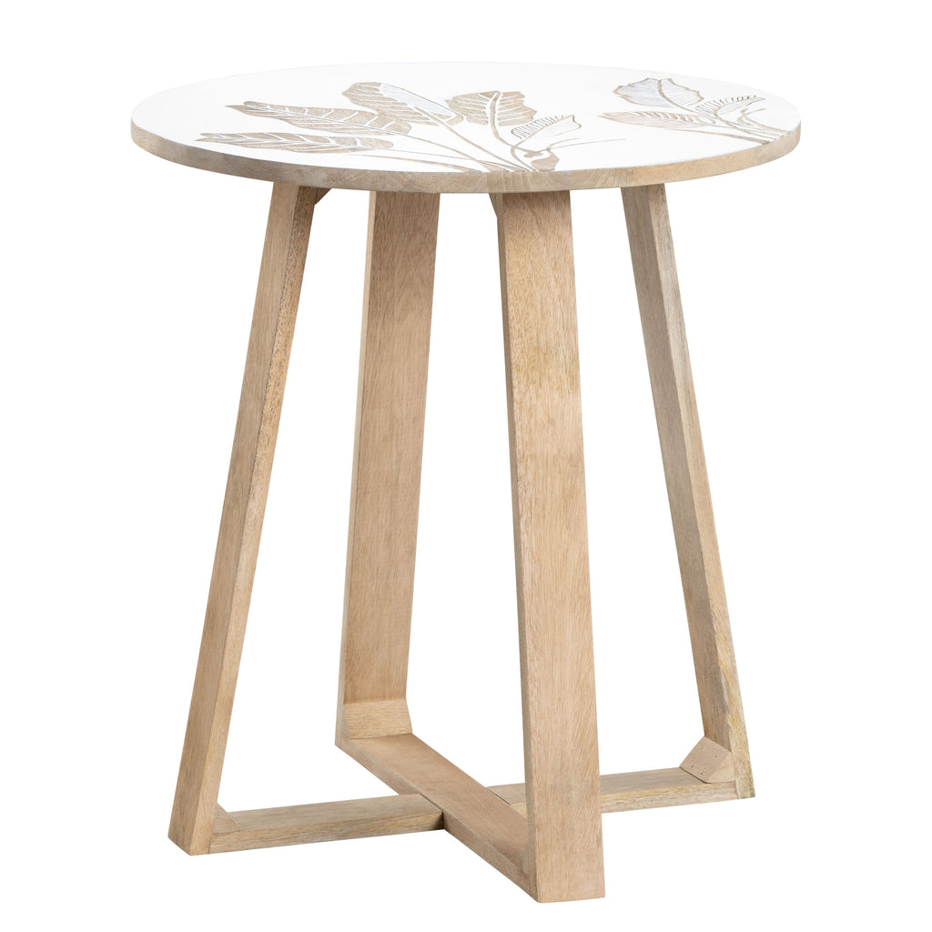 The Seaside Accent Table by Crestview Collection is a coastal-contemporary delight, with its four-post legs that gracefully reach the floor and then turn inward to converge at a central connecting point. This unique design element not only adds stability but also creates a visually striking and captivating focal point that's sure to draw attention. At the heart of this piece, you'll find a circular wood top that's been elegantly painted in a smooth white finish and showcases a hand-carved palm leaf pattern. This table is a conversation starter and a piece that will transform your living space into a coastal haven.
