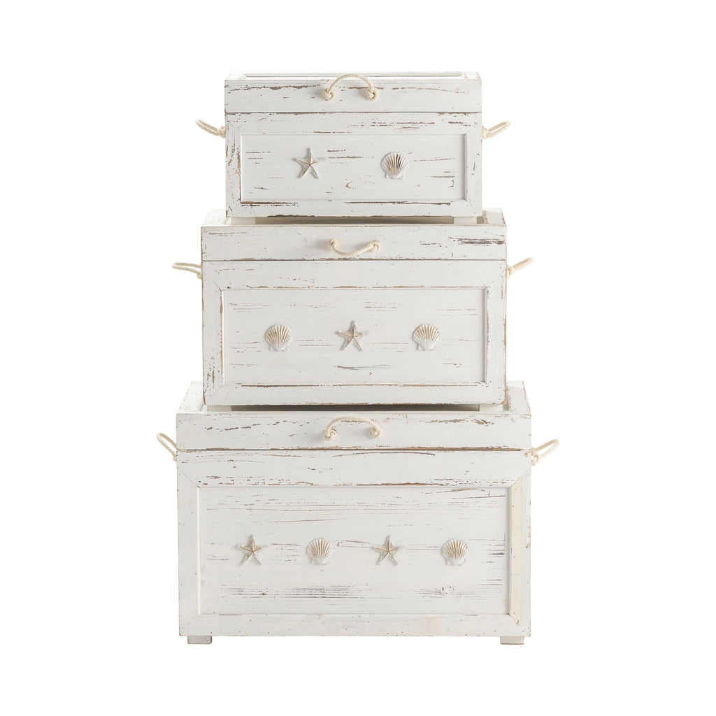 This Crestview Collection Seaside White Shell Set of 3 Trunks is a stack of storage heaven, with softly distressed white finish for any space in your home. Vibrant seashell and starfish accents on each of the three chests might inspire you to plan that ocean vacation. Use each chest separately where you need hidden storage, or fill them up and stack for a singular piece worthy of conversation.