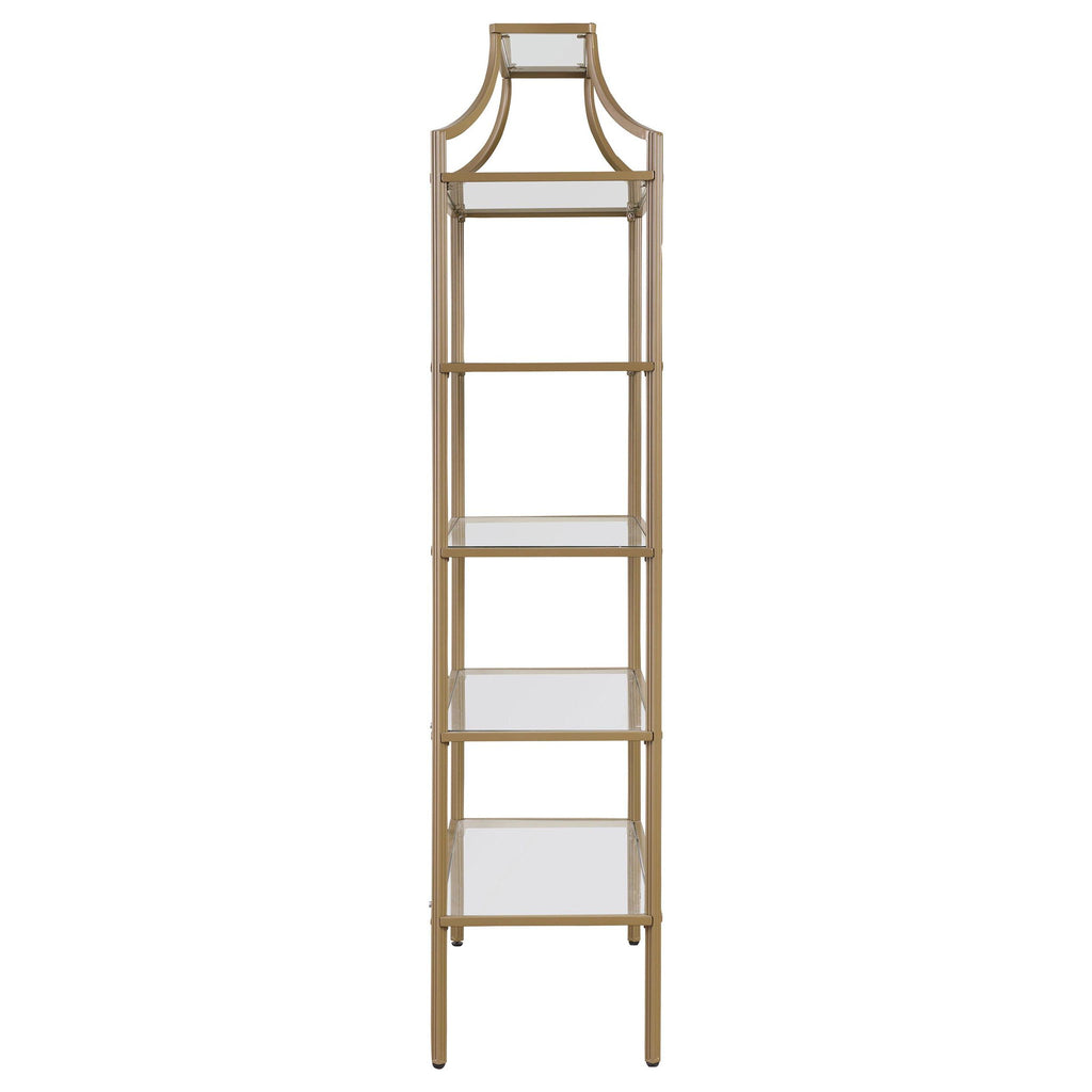 A call for strength and style gets answered by this bookcase. Contemporary style allows for easy placement within your space. The stylish metal frame in gold creates conversation. Enjoy durability as all glass elements are tempered. Updated unit boasts five (5) open shelves for use as storage or display.