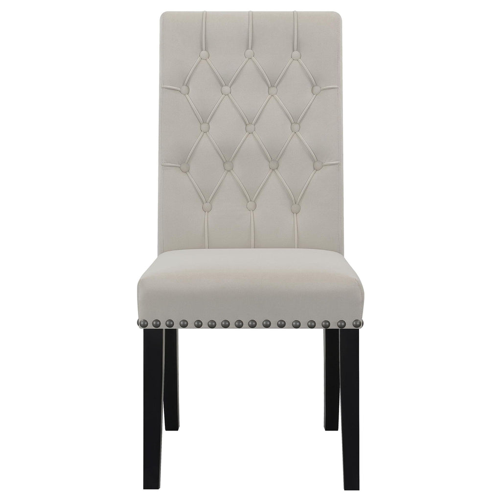 Bring together family and friends at this modern rustic style dining table set. The table features a rectangular, thick, white marble top that is spacious enough for six people. Sleek open and airy trestle base with a center punch out, rustic espresso striking color combination lends a dramatic touch and grounds the room elegantly. The set of chairs with a rolled backrest with button-tufted details lends a traditional aesthetic to a space. Also, bringing to your home the classic elements is a padded seat with individual nailhead trim that offers a charming detail.