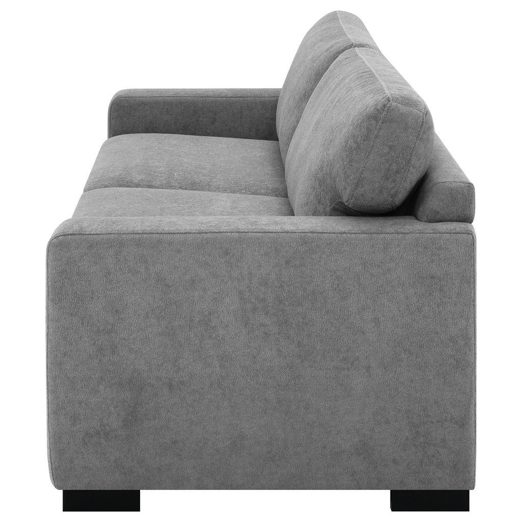 Center your stylish living space on a contemporary sleeper sofa. In light grey upholstery with a soft look and feel, it creates an inviting focal point while offering both daily seating and overnight accommodation. It features plush seating with spring supports and foam cushions for excellent comfort. The sofa features track arms, with wide block feet in a black finish that adds contrast and depth. Choose this sleeper sofa to bring style and flexibility to your home.