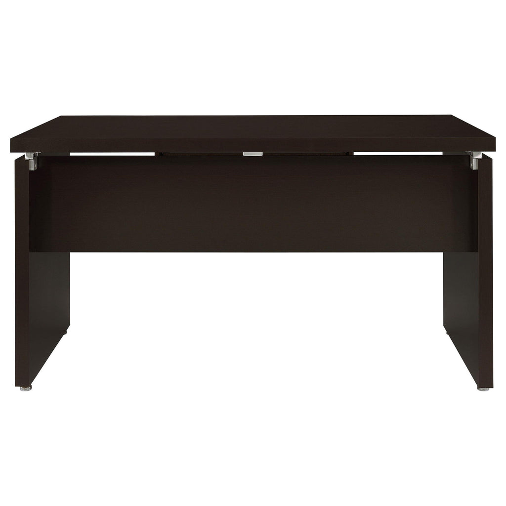 This modern computer desk blends sleek design with practical features for a sophisticated workspace. Constructed from durable engineered wood with a wood-look laminate veneer, it offers both style and functionality. The floating top design adds a contemporary flair, while the keyboard tray provides easy access to essential devices and accessories. Finished in a rich, versatile tone, this desk is perfect for home offices, providing a clean and minimalistic aesthetic with ample work space for your computer, documents, and more.