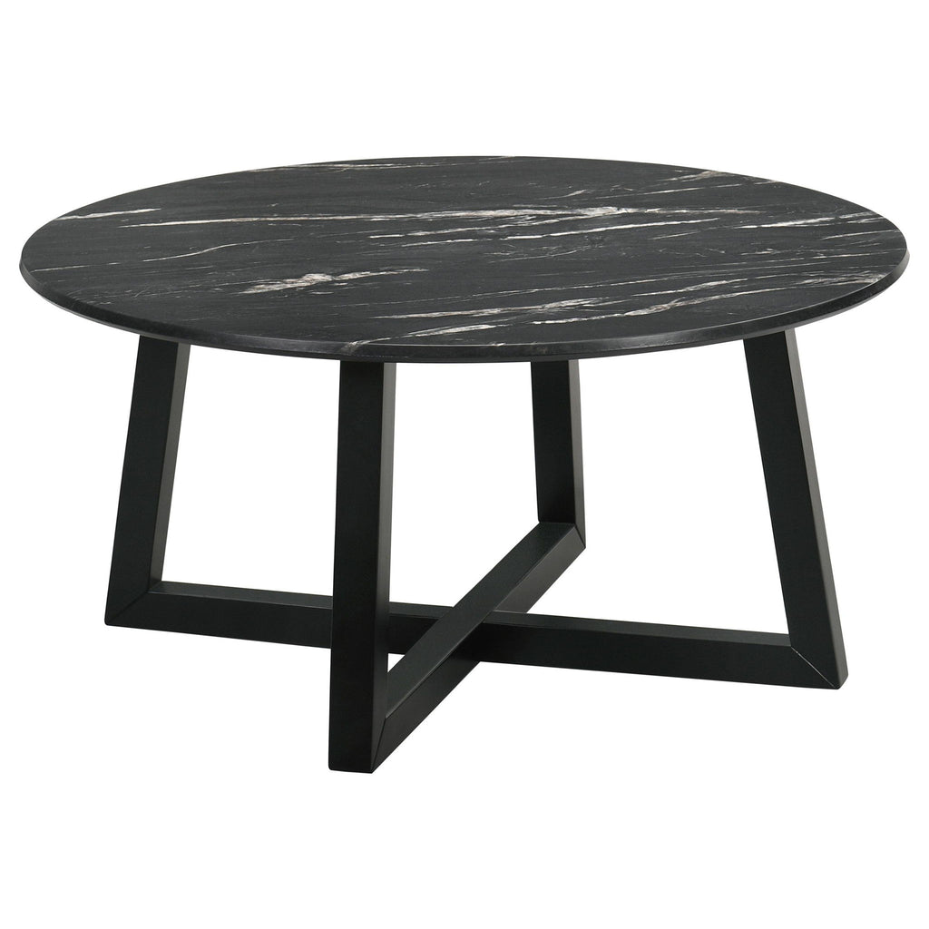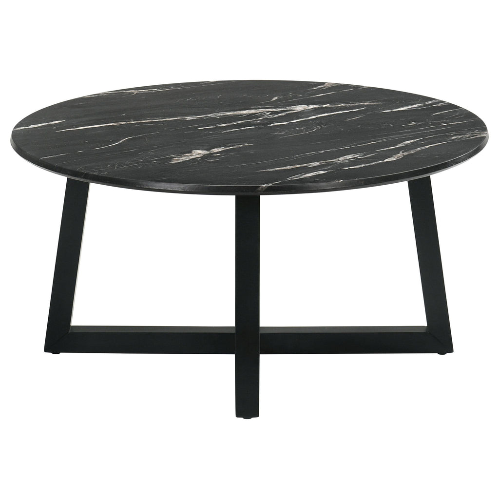 The coffee table stands as a centerpiece, its round form a canvas for the rich, decorative black faux marble that offers the beauty of natural stone with none of its fragility. The high-pressure laminate surface is a triumph of design, melding high durability with ease of maintenance, a savvy choice for the modern home. Its solid wood base, sculptural in its form, lends a steadfast quality, while the marriage of the materials speaks to a sophisticated taste. This cocktail table is a gathering spot for loved ones and a testament to smart living, where style and practicality are in perfect harmony.