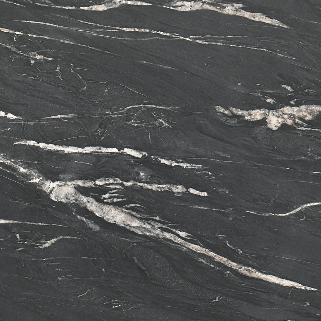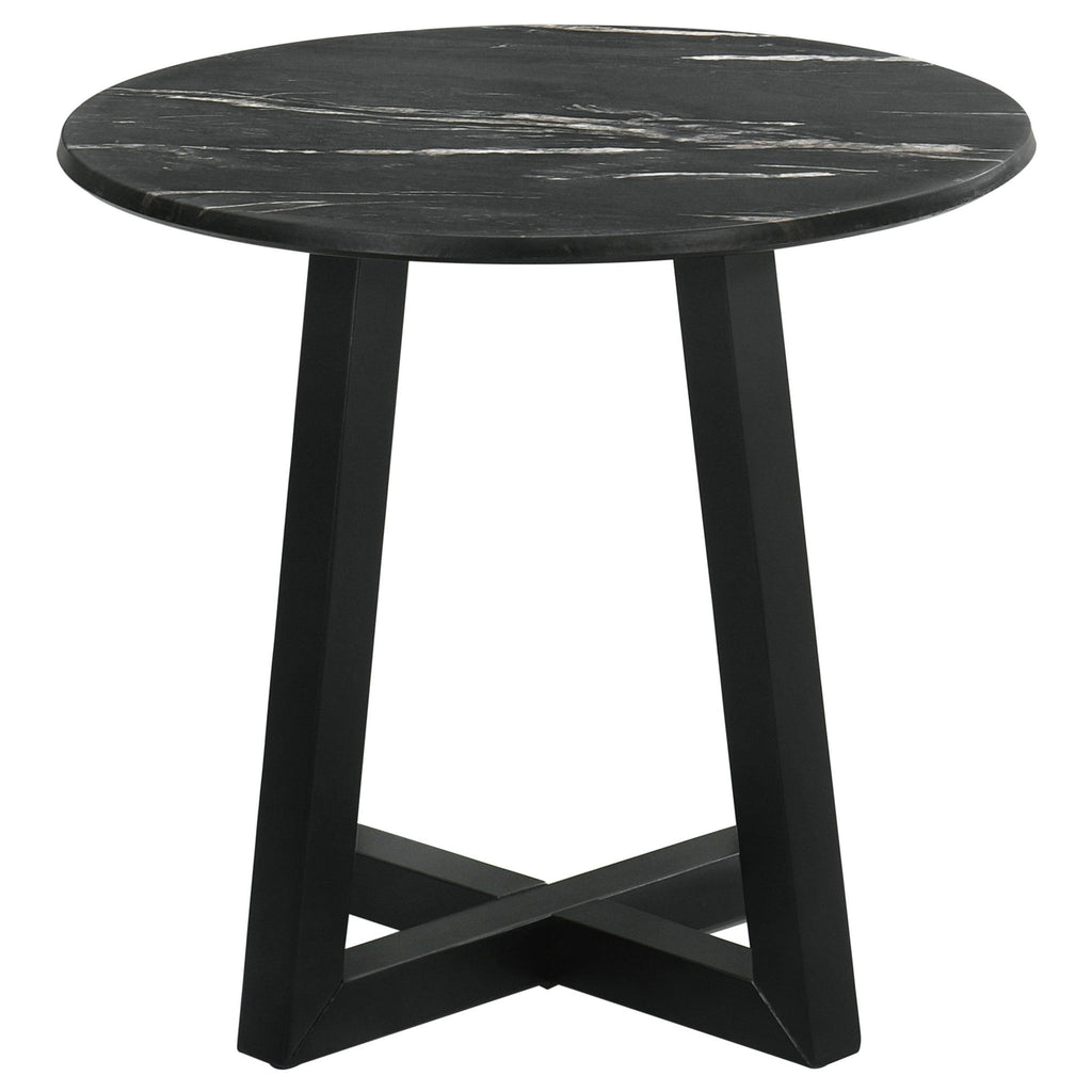 Gracefully poised, the round end table is a modern muse clad in black faux marble, a high-pressure laminate that promises enduring strength and effortless care. This exquisite tabletop, impervious to the whims of daily life, offers the opulent look of marble without its demanding nature, making luxury more accessible and relaxed. Resting on a solid wood base, the table's silhouette is a celebration of stability and elegance, with angular legs that create an intriguing visual dialogue with the smooth curves above. It's a versatile side table that elevates the art of living, turning the simple act of placing down a book or a drink into a moment of understated sophistication.
