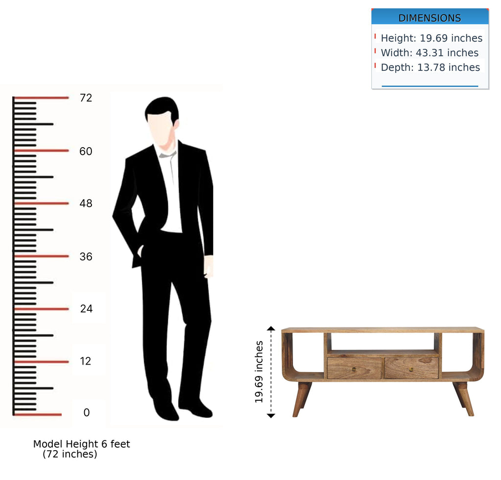 - Features: 100% solid mango wood,natural oak-ish finish,unique ridged design,4 Nordic style legs,2 spacious drawers,Brass knobs