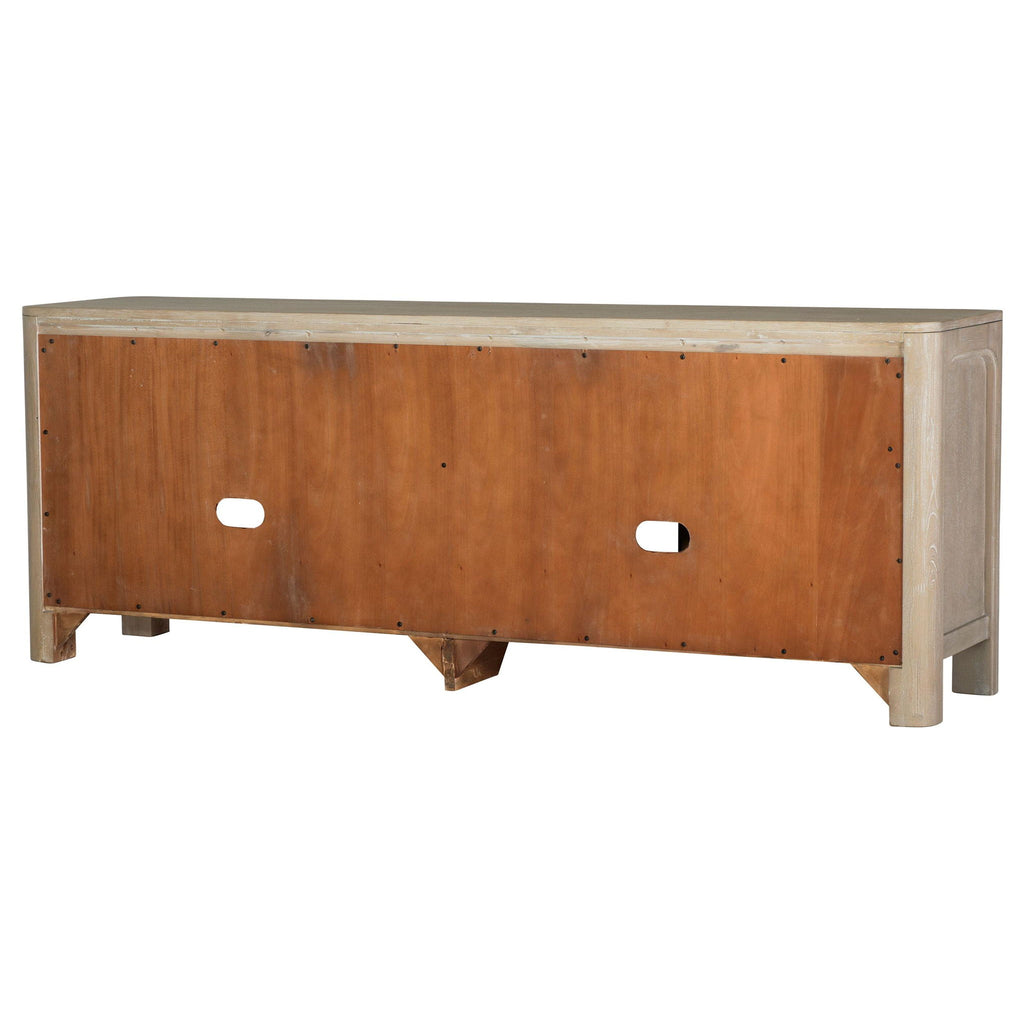 With its balanced proportions and sculptural form, this TV stand merges graceful design with everyday utility. Arched detailing softens the wide frame, while dual sliding glass doors reveal interior shelving for components and décor. Built-in cable cutouts keep wires neatly tucked away. Made from mahogany, engineered wood, and mango veneer, this media console offers lasting strength and natural texture—ideal for any living room setup.