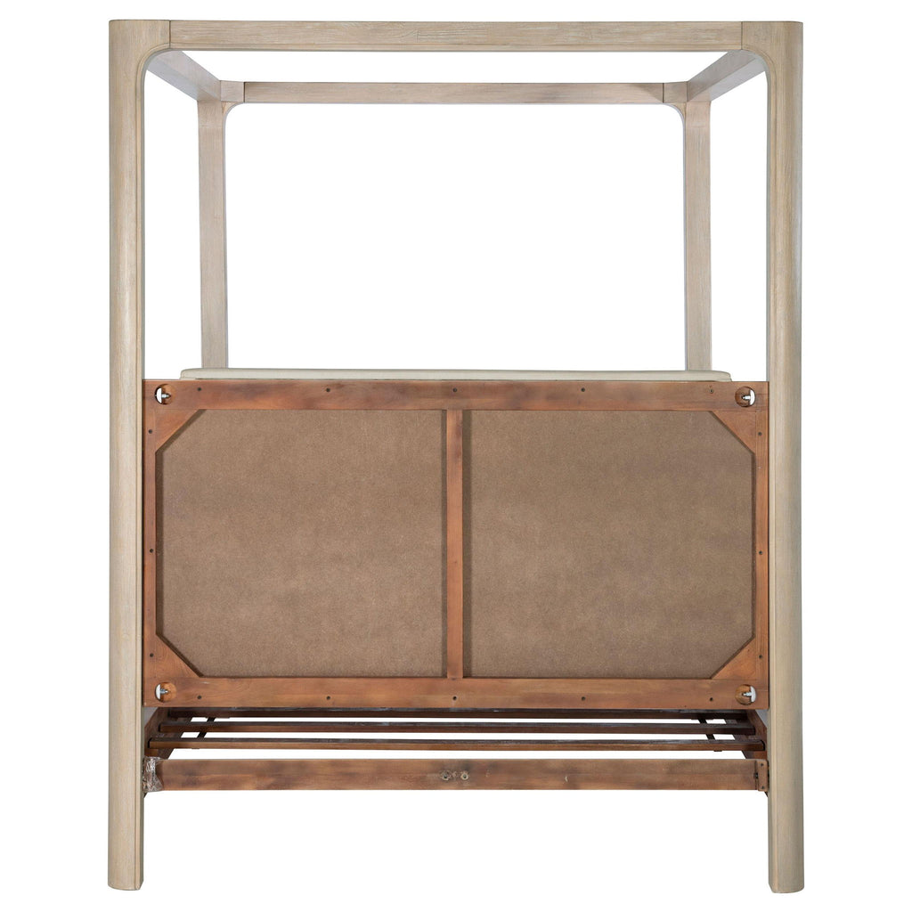 Airy and architectural, this canopy bed brings sculptural presence and soft romance to the bedroom. Gracefully arched posts frame a tall silhouette, while an upholstered headboard adds a tailored layer of texture and comfort. Designed with a platform panel base, it offers lasting support without the need for a foundation. Crafted from mahogany, engineered wood, mango veneer, and fabric, this piece blends strength and serenity in perfect harmony.