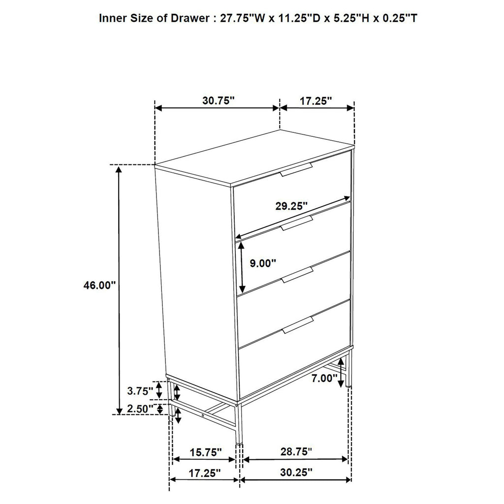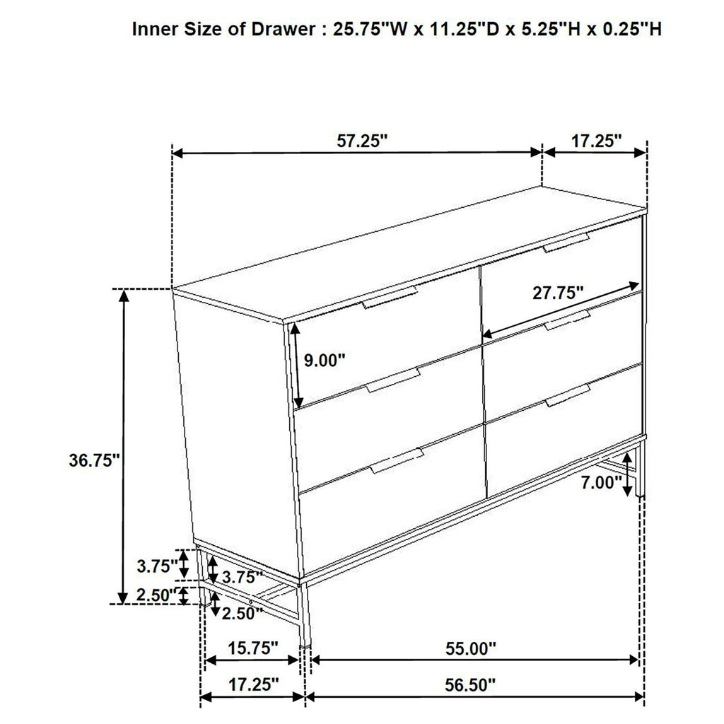 Delivering the perfect mix of style and functionality, this five-piece modern bedroom set centers on an upholstered bed and includes a nightstand, chest, and dresser and mirror. Delivering a bright white finish, the set offers light, airy ambiance, perfect for an open bedroom design. The bed boasts a padded headboard complete with hexagonal tufting in dark gray fabric upholstery. The low footboard adds to its open presentation while black accents coordinate with storage pieces that feature long bar handles on drawers. Offering plenty of space for clothing and accessories, the set creates clean, crisp aesthetics in your stylish bedroom.