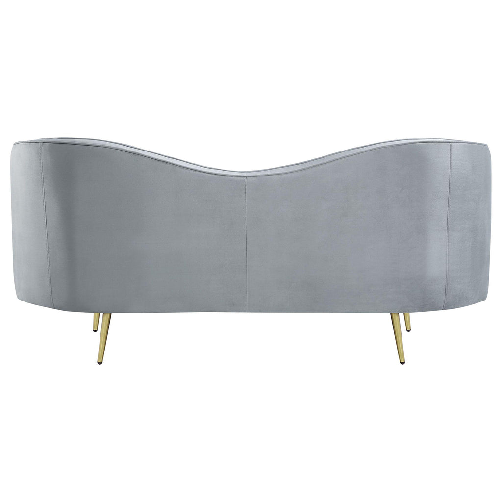 Fashionable matching pieces inspired by artistic mid-century design add a romantic allure to any space when this two-piece sofa set becomes a focal point. Create an artful look with this set featuring decadent gray velvet upholstery and gleaming gold finish stainless steel tapered legs. The dimensional factor of vertical channeling presents an interesting visual to each piece’s interior back, as kidney silhouetting highlights the iconic look of parlor inspiration from a retro era. This set is fully encased in solid wood and offers sinuous spring durability for seating comfort. Set includes one sofa and one loveseat.