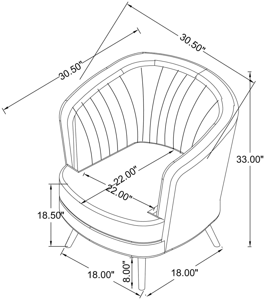 Bring mid-century charm and modern glamour to your space with this sculptural accent chair. Wrapped in soft grey velvet, it features a smooth barrel silhouette with vertical channel tufting that enhances its tailored appeal. Plush cushioning offers exceptional comfort, while gold stainless steel tapered legs provide a sleek, elevated finish. Built with a durable solid wood frame, this chair serves as a refined focal point in living rooms, bedrooms, or stylish lounge settings.
