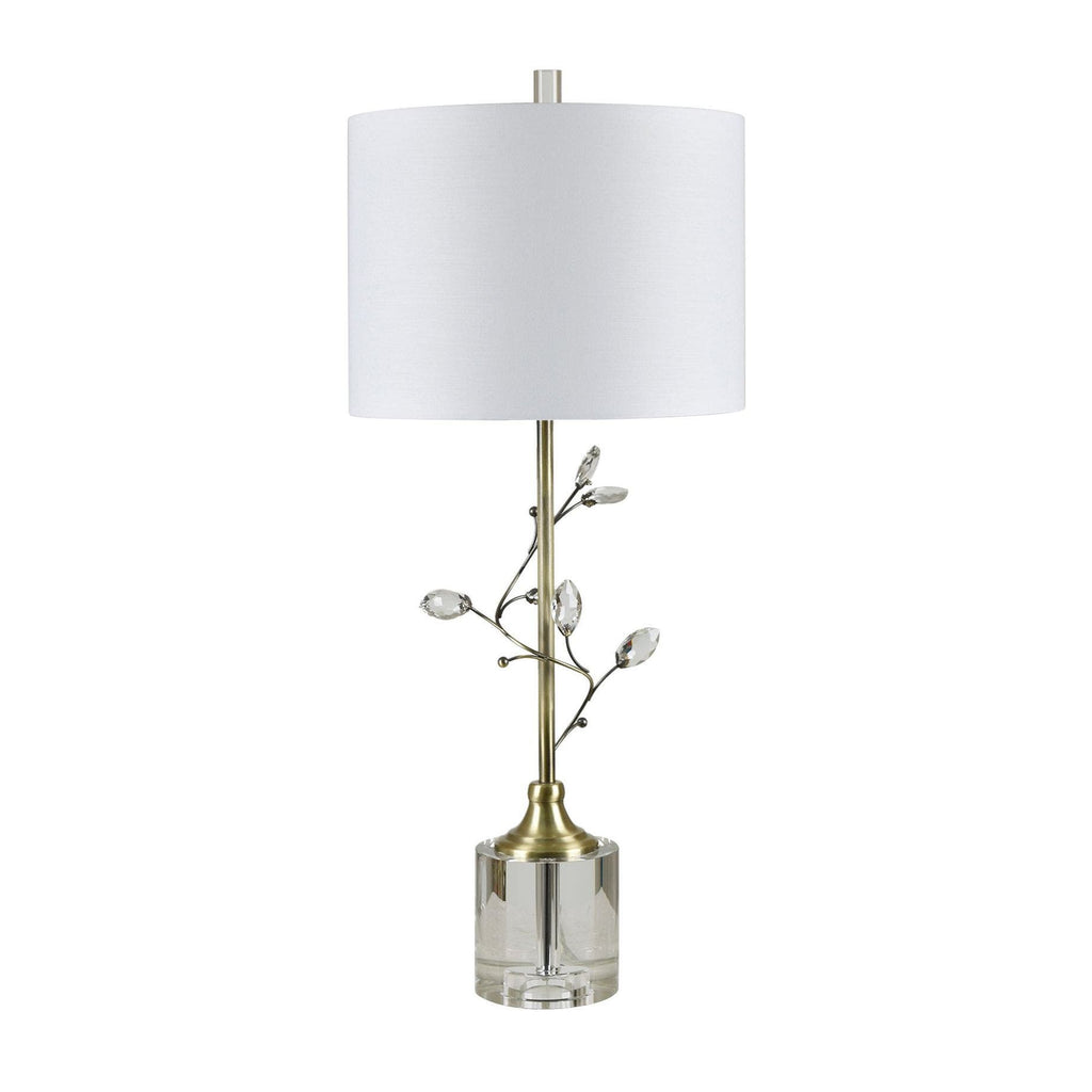 The Crestview Collection Sparkle Table Lamp captivates with its climbing branch design adorned with crystal leaves that elegantly wrap around a polished brass stem. Mounted on a crystal plinth base and topped with a white linen shade, this lamp exudes luxury and refined charm, perfect for elevating any sophisticated space.