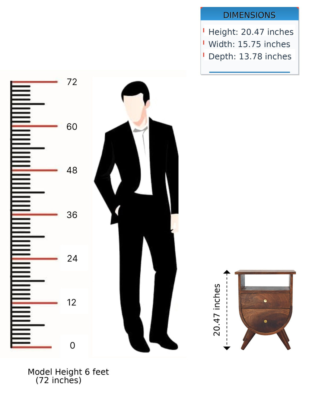 - Split Chestnut Nightsand - Introducing our Split Chestnut nightsand, a charming addition to your bedroom. With a curved shape concept, and convenience with 2 drawers and a open slot, it combines elegance and functionality. Crafted from 100% solid mango wood in a chestnut finish it has shiny brass knobs that add a touch of sophistication.