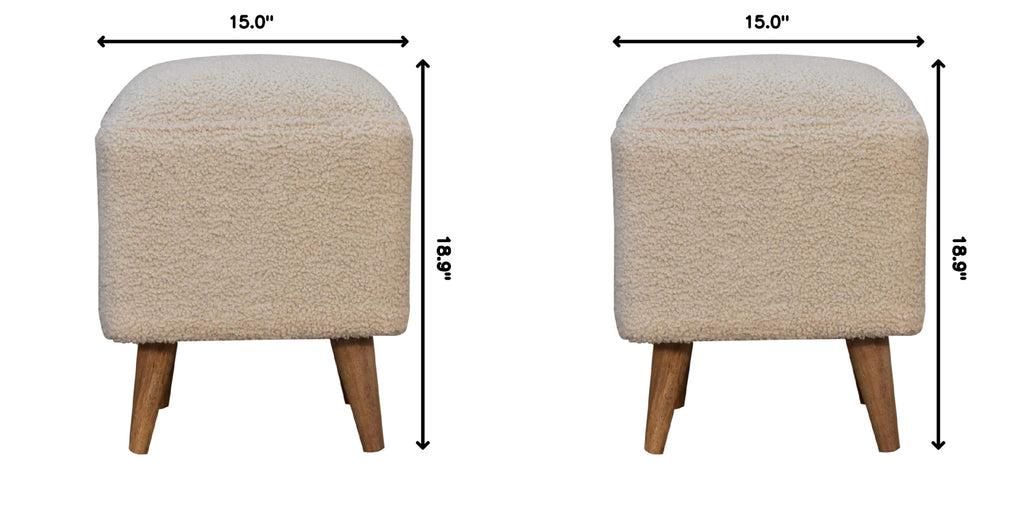 - Features: squaoval, boucle, cream, footstool, living room, nordic, upholstered, solid wood, mango wood, accent piece