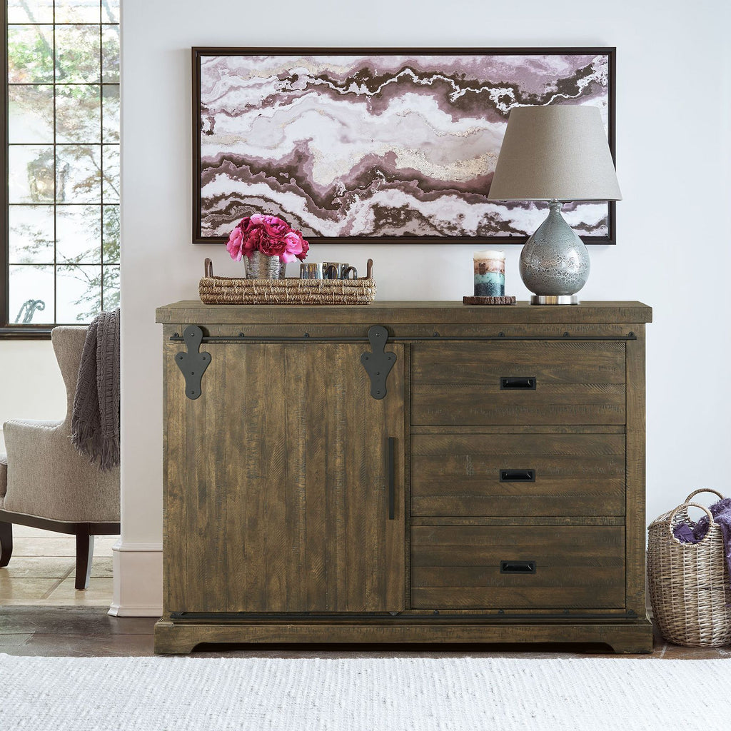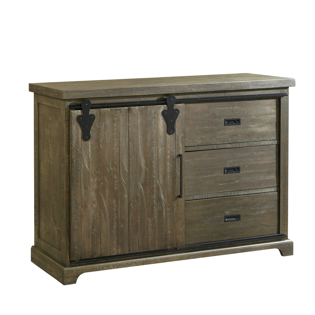 The Stone Server brings refined style and warm design to your dining area. Constructed of wood solids and veneers with a smoky finish, this piece offers three spacious drawers and a trendy sliding door. Decorative dark finished hardware completes the look of this handsome server.
