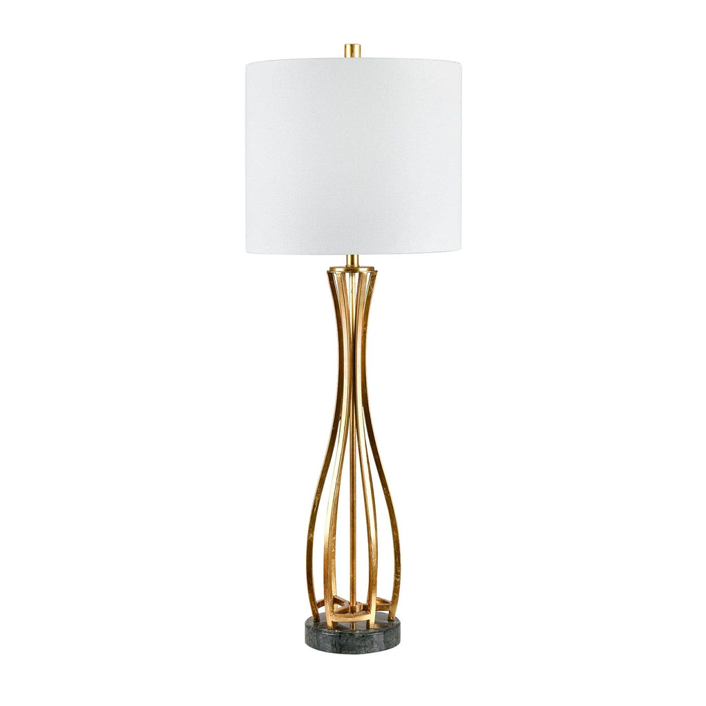 The Crestview Collection Streeter Buffet Lamp features an elegant open-cage metal design in a vase shape with a luxurious gilded gold finish. Resting on an emerald green marble base and topped with a white shade, this lamp brings a sophisticated, contemporary touch to any space.