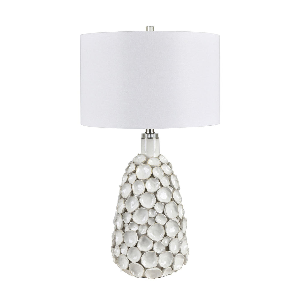 The Crestview Collection Emile Table Lamp stands out with its completely handcrafted, dimensional design, offering a distinct artisanal feel. Its simple white glaze enhances the craftsmanship, allowing the intricate details to shine without overpowering the overall aesthetic, making it a beautiful and elegant addition to any space.