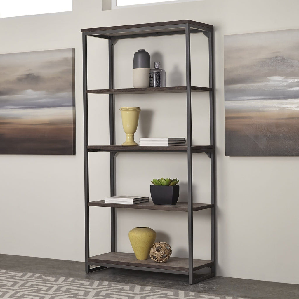 - Constructed of wire-brushed pine veneer over engineered wood in a multi-toned driftwood finish with metal tube framing in a powder-coated, dark grey painted finish