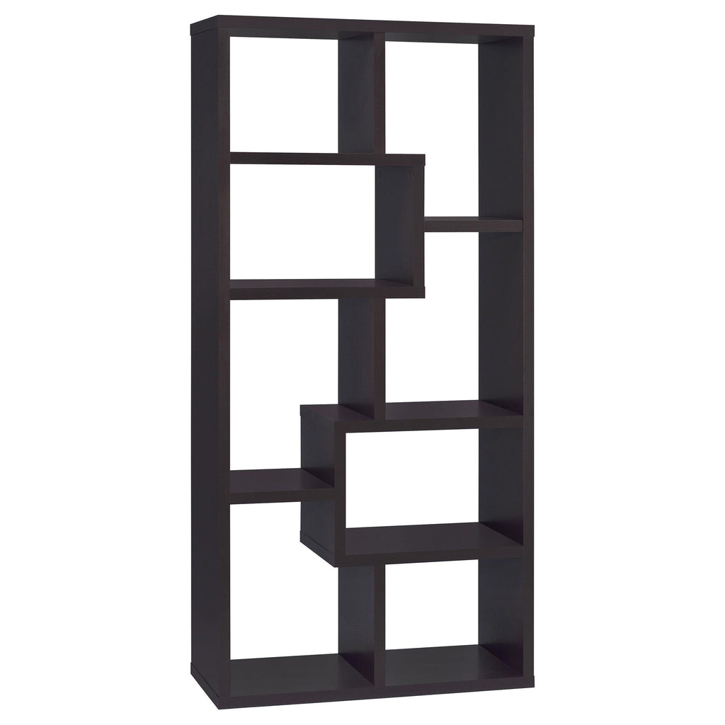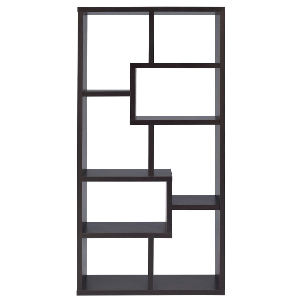 Stately, sturdy, and strong, this bookcase is an excellent choice for a library or living room. Featuring seven convenient shelves, it offers lots of space for storage. The shelves are arranged in a bold, geometric design, giving it a modern appearance. It's available in four stunning colors to accentuate any decor. Constructed from high-quality materials, this bookcase is a safe spot to store your most precious belongings.
