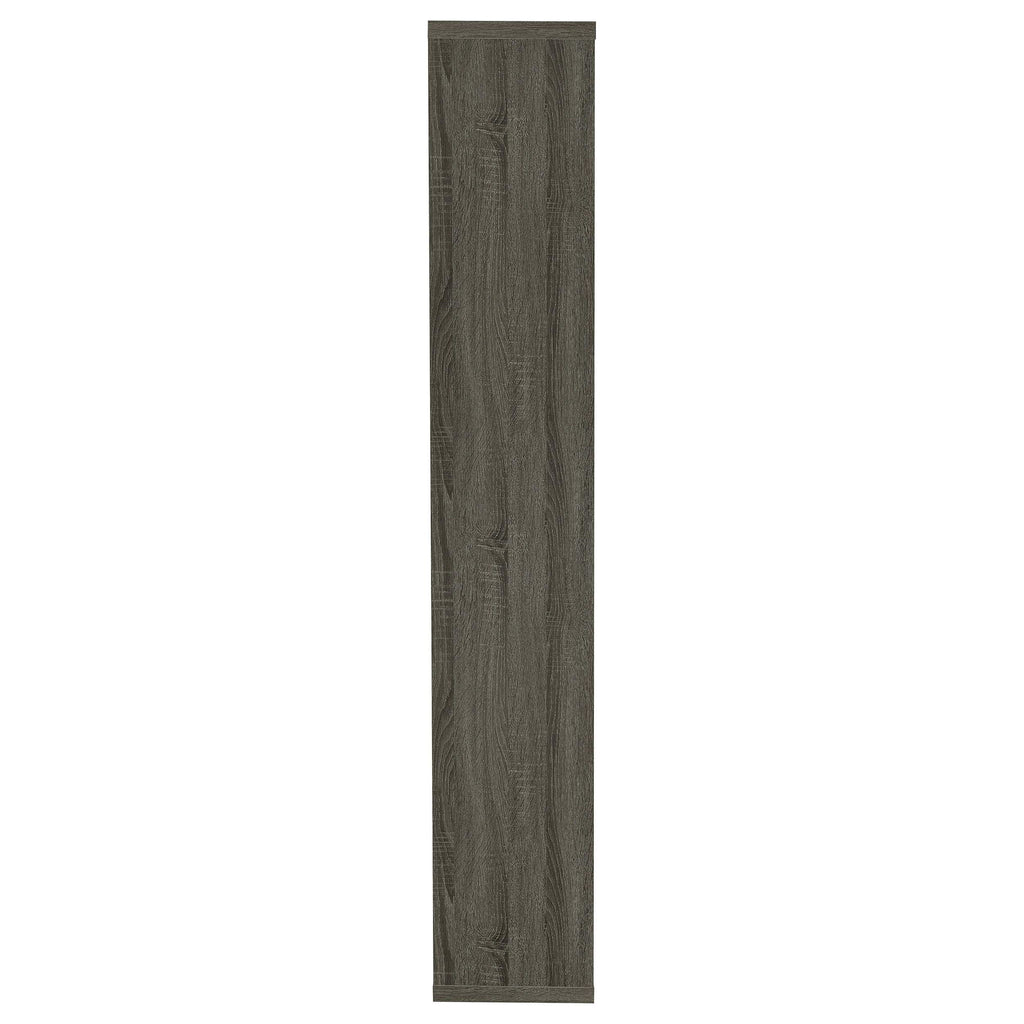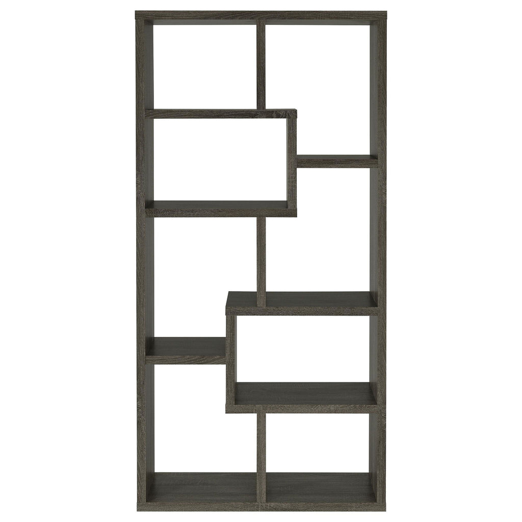 With six convenient shelves, this bookcase is perfect for keeping your reading materials in one place. Sturdy and durable, it's expertly crafted from MDF, particle board, and engineered veneer. Its striking silhouette is bold, yet refined with geometric shapes of various sizes. It's available in your choice of four stunning finishes to match your decor. Whether it's placed in a home office, living room, or bedroom, this bookcase is an exquisite enhancement to any home.