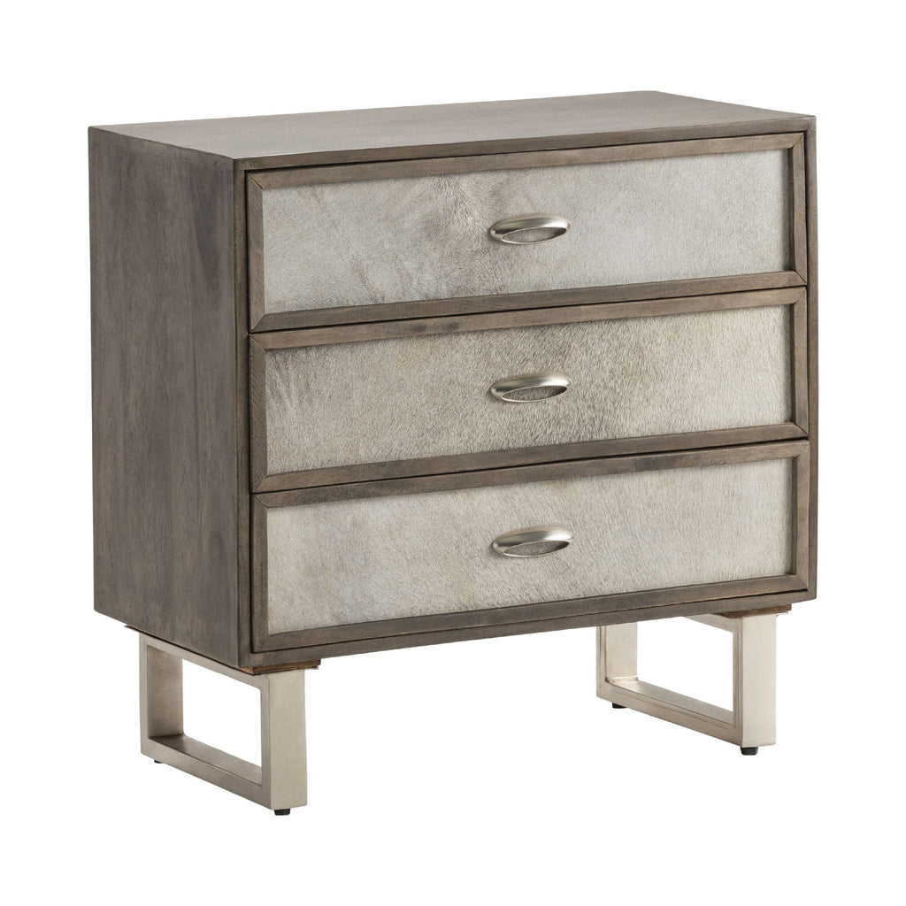 The Crestview Collection Theodore 3-drawer Gray Cowhide Chest is a beautiful chest sitting atop sleigh legs. This chest has three drawers each covered with gray cowhide on the front. The wooden construction has a gray finish and is accented by the metal drawer pulls. This chest works perfectly as an accent piece in your living room or hallway or even as a nightstand in your bedroom.