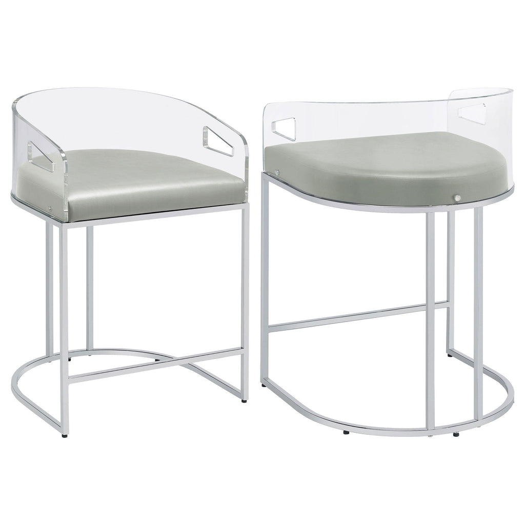 Ultra-modern with a retro-inspired vibe, this pair of stools make a striking piece to a dining room space. With a curved backrest in a clear acrylic material, each stool offers an open and airy design. Rest comfortably on a leatherette cushion as you dine or sip a cocktail. In addition, each stool is supported by a slim metal legs in a lustrous chrome finish and a base shape that mimics the rounded acrylic backrest. Pull up a pair of these stools to a kitchen bar or complete a compact home bar.