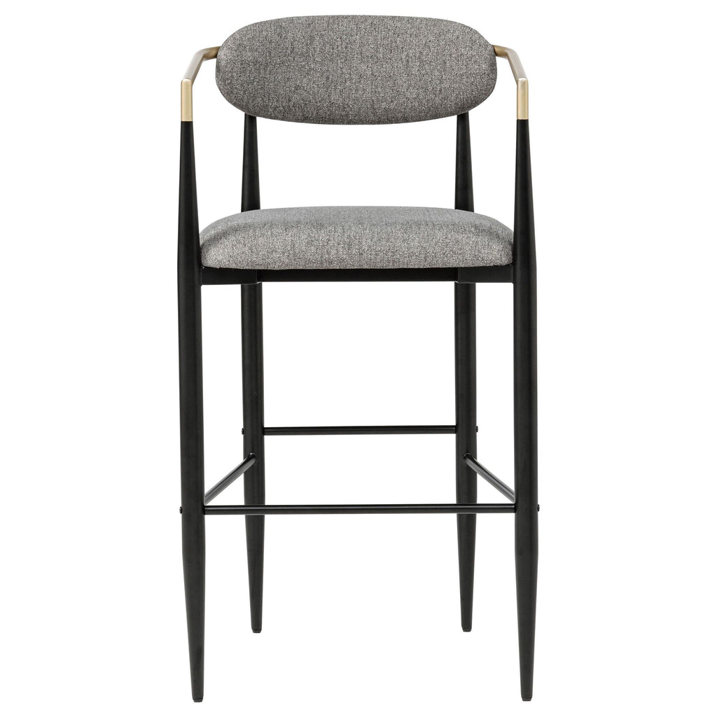 Take your kitchen or dining room decor to stylish new heights with the mid-century flair of a set of two modern barstools. Each offers an airy, open silhouette with its pairing of a plush seat and slender backrest, both with foam cushioning and stylish upholstery. The gentle curvature of the seatback continues in slim arms that receive a medium brown finish that complements both the fabric and the black finish of the base. The base of each barstool offers tapering legs and slim support bars that create a built-in footrest for added comfort and support. This plush barstool is the ideal solution to a bar table in a relaxed dining room or a home lounge in need of elevated style.