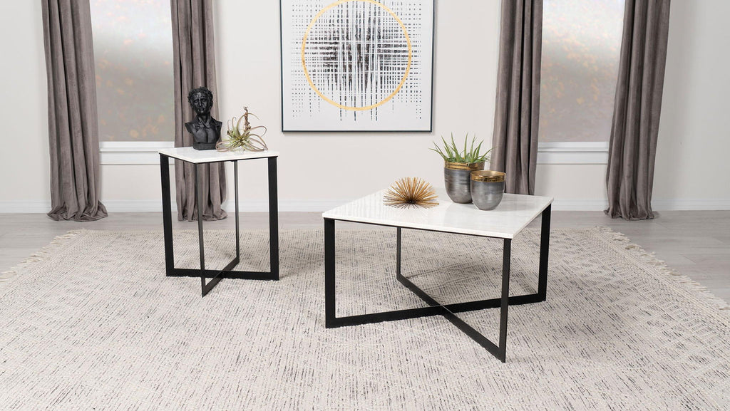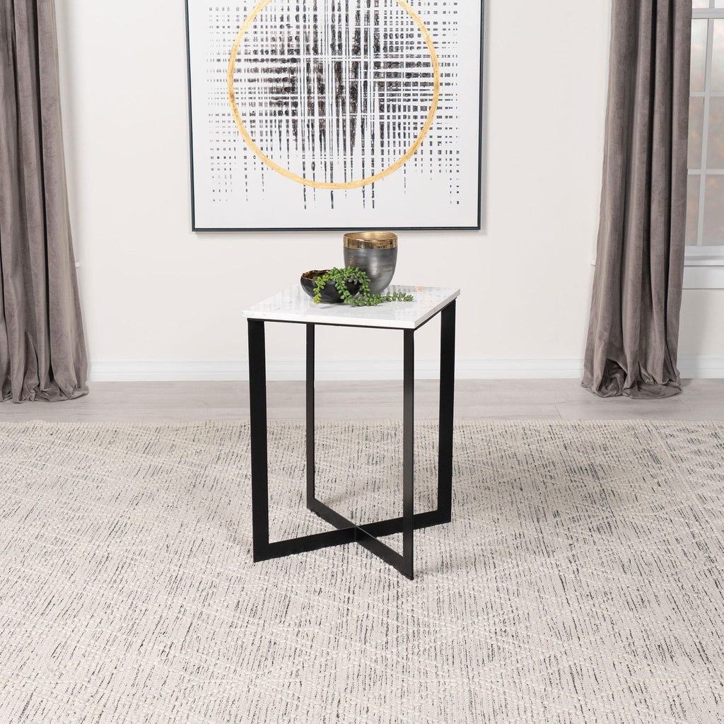 Clean lines take on a geometric look with extra personality, perfect for infusing some energy into your casual space. This end table and its contrasting palette becomes a focal point in any living room or bedroom. Feast your eyes on a crisply structured thin black finish metal base forming an eye-catching crisscross profile. Embellished with a marble top offering variations of white and touches of gray, this side table creates inherent elegant style. Perfect for use as a sofa or chair partner, or as a display venue for greenery or décor.