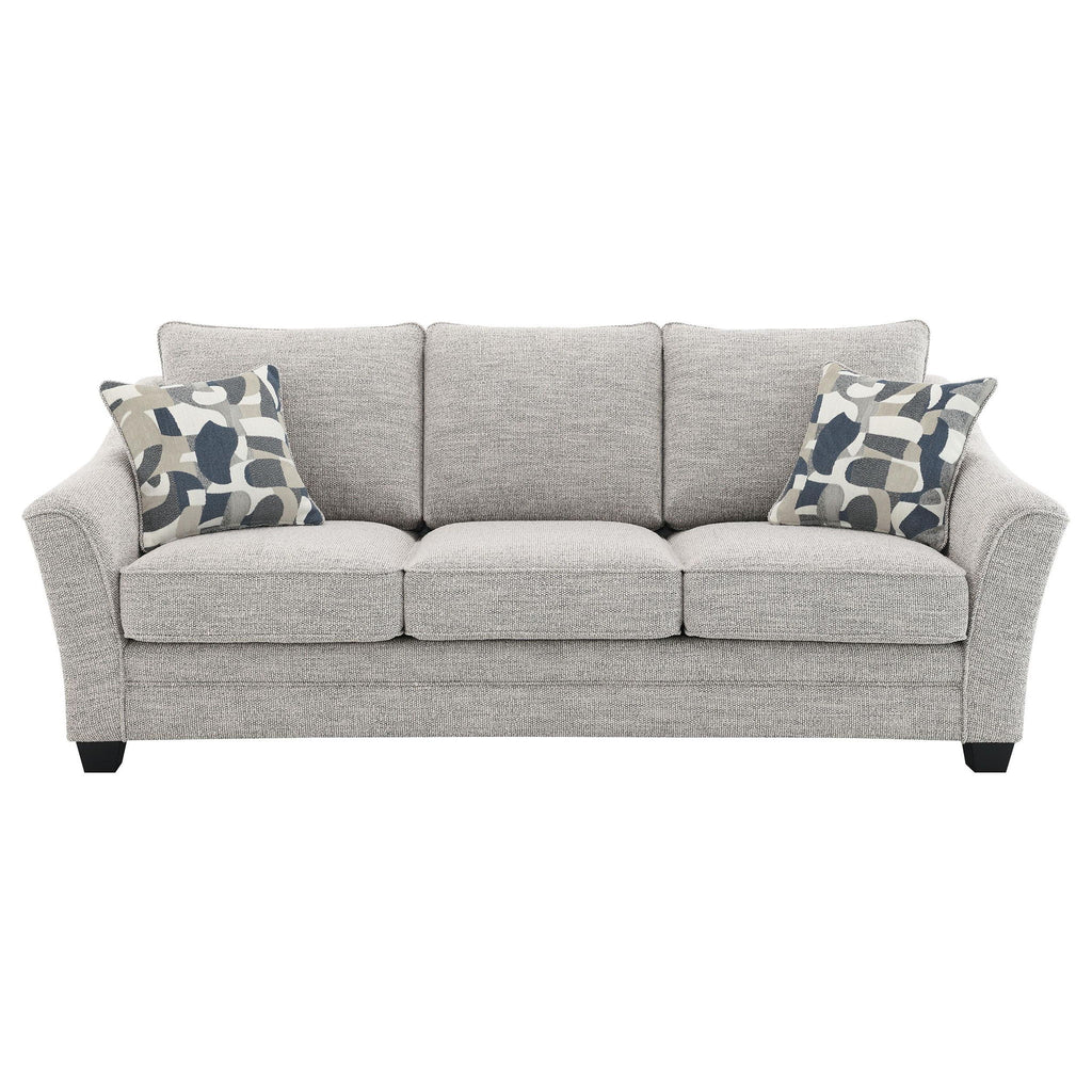 Create comfortable seating while embracing style with this well-tailored sofa collection. Upholstered in a textured, multidimensional gray boucle fabric, it's perfect for camouflaging wear and offers impressive texture and dimension in your living room. The sofa features sloped arms, boxed seat cushions, and tall back pillows, all finished with welt trim, offering wonderful comfort and support for seating and lounging. A classic silhouette is updated with gently sloping, flared armrests, creating a fresh, inviting profile. The design is completed with tall, tapering block legs in a dark finish, providing a sturdy foundation and completing the look.