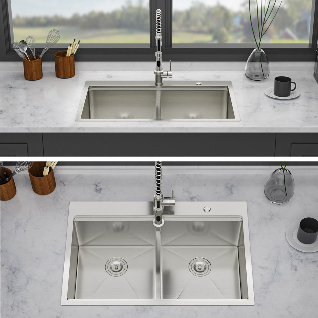 Topmount Drop In Double Bowl Kitchen Sink. 16 Gauge Stainless Steel - Brushed Nickel
