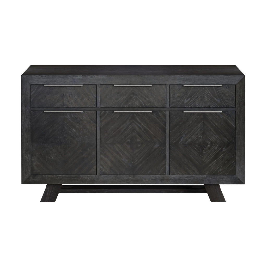 Elevate your dining space with the Transcend Server, where bold design meets functional elegance. Rich charcoal tones beautifully enhance the intricate woodgrain, adding warmth and depth to the space. Crafted from a durable wood frame with a stunning oak veneer, the server features eye-catching chevron and herringbone patterns for a striking visual statement. Sleek metal handles provide a modern accent, allowing for easy access to spacious storage, while brown felt-lined drawers protect delicate items, adding a luxurious touch. The Transcend Server is the perfect blend of style and functionality, designed to complement any contemporary dining room.