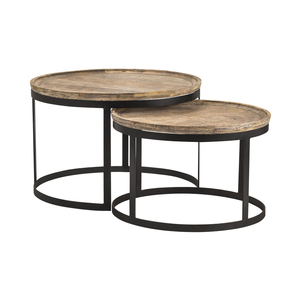 This set of Crestview Collection Bengal Manor Round Cocktail Tables includes two nesting tables made of wood and metal. The black metal finish is enhanced by the contrasting light-brown finish on the wooden top. Each table top has a slight rim to keep items steady on the surface. Bring rustic elegance to your home with these beautiful tables.