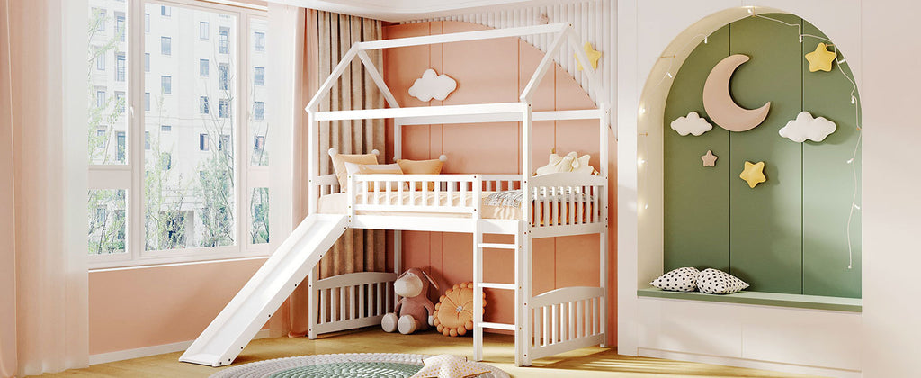 - [Unique Design]Crafted with a whimsical playhouse design,comes with slide , this loft bed offers a comfortable and exhilarating experience during both sleep and playtime that will let their imaginations run wild. Perfect for hours of entertainment and relaxation, the playhouse design makes this loft bed the perfect centerpiece for any bedroom.